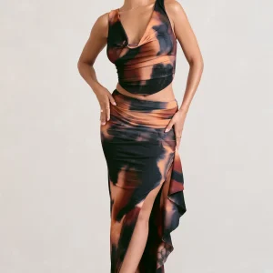 La Belle | Falda Maxi con Volantes y Abertura en el Muslo con Estampado de Humo Naranja