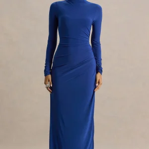 Alluring | Vestido largo en Azul cobalto de Cuello Alto con Detalles Fruncidos