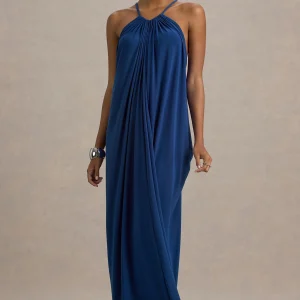 Tammy | Vestido largo azul eléctrico con escote halter y espalda estilo racer