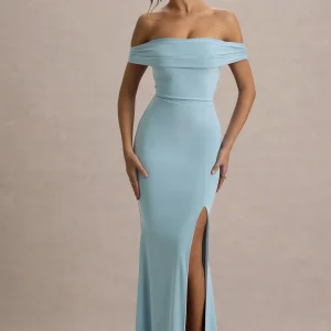 Alaine | Vestido largo en azul marino con mangas abullonadas y escote bardot