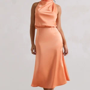 Geena | Vestido midi melocotón satinado con cuello alto y torcido.