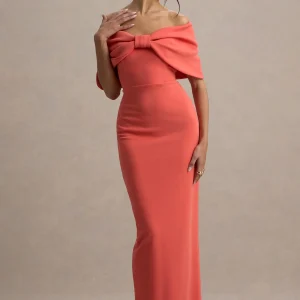 Cornelia | Vestido largo con escote bardot con detalle de lazo en naranja