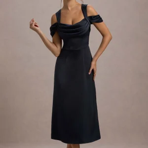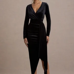 Arcadia | Vestido midi de terciopelo negro drapeado con mangas largas