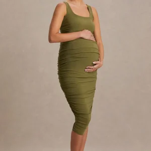 Lisbon | Vestido premamá midi en color oliva con escote cuadrado y fruncidos