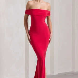 Law of Attraction | Vestido largo rojo con escote bardot y abertura lateral