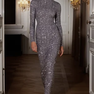 Galaxy | Vestido Maxi Plateado de Lentejuelas con Cuello Cisne y Mangas Largas