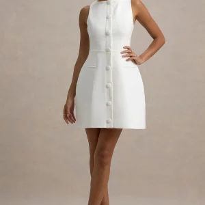 Cheri | Vestido corto blanco tipo traje entallado sin mangas y botones forrados