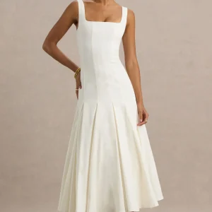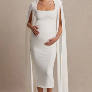 Flawless | Vestido midi premamá blanco con escote cuadrado y mangas capa