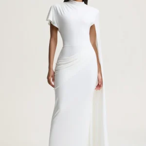 Tropic | Vestido Maxi Blanco con Escote Alto, Manga Larga de Capa y Detalles Fruncidos