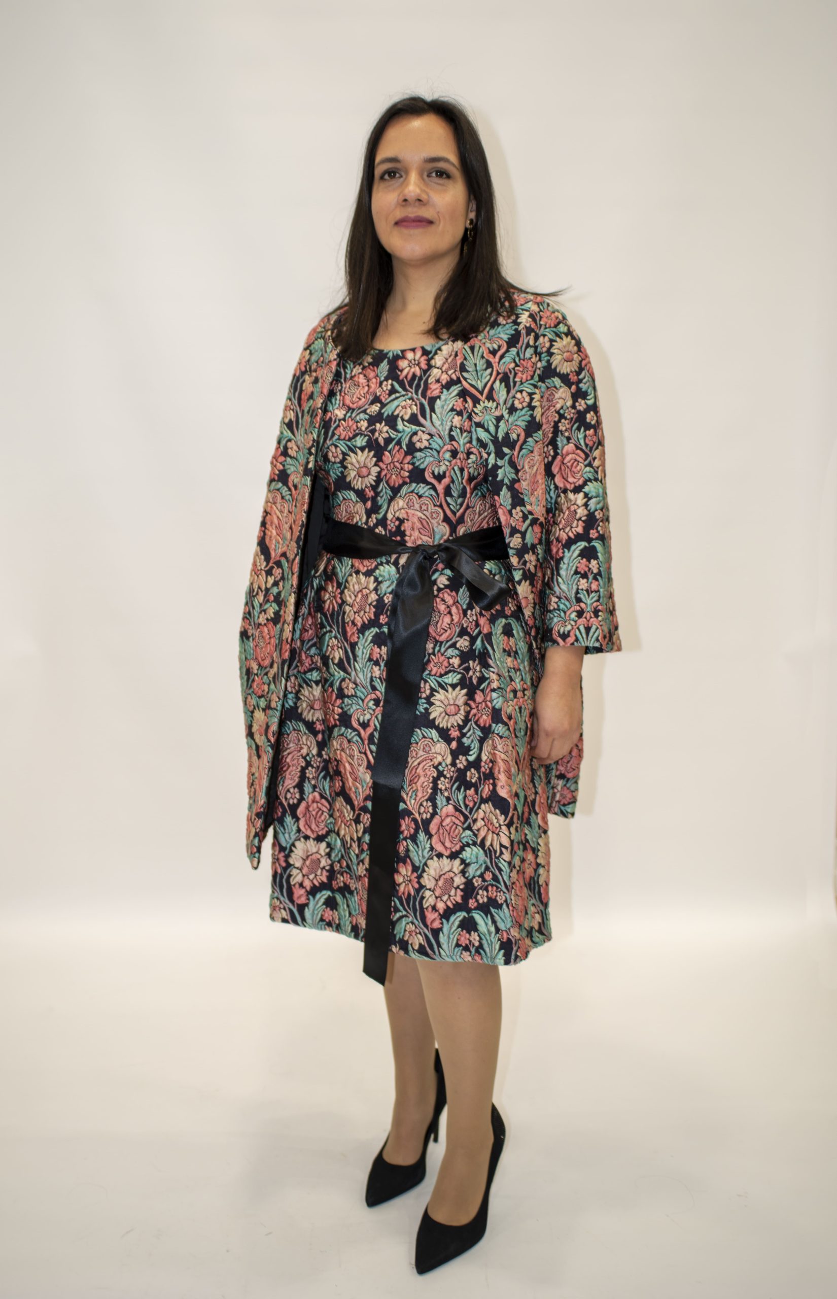 Este elegante abrigo de fiesta de Matilde Cano presenta un sofisticado estampado floral brocado en tonos pastel sobre un fondo azul marino, que aporta un toque de distinción a cualquier look. Con escote redondo y manga tres cuartos, su diseño abierto lo convierte en una prenda versátil y estilosa, ideal para ocasiones especiales donde se busca destacar con elegancia.