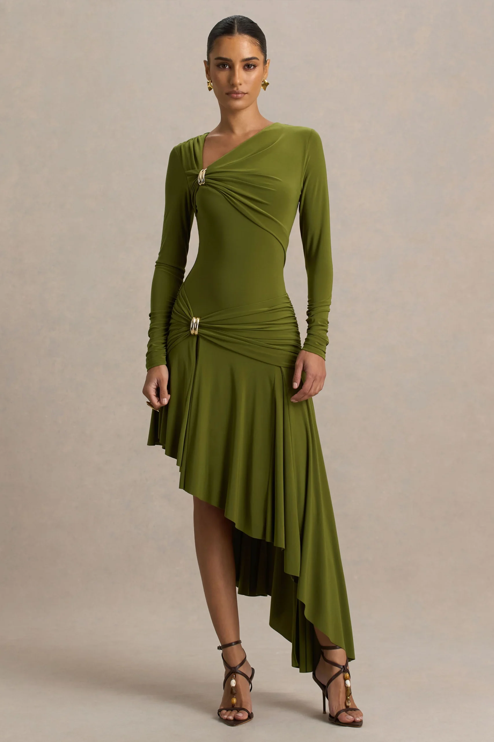 Alexia | Vestido Maxi Verde De Escote Asimétrico Con Apliques y Detalle Fruncido