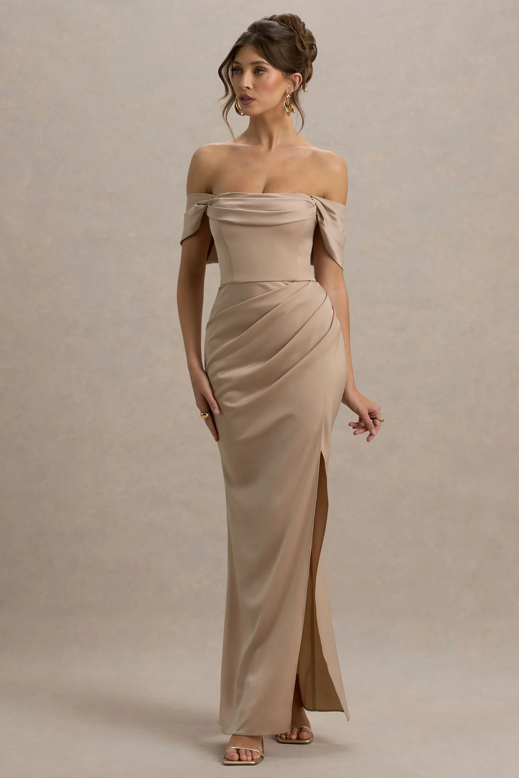Un vestido que irradia elegancia atemporal y sofisticación. Este impresionante vestido largo está confeccionado en un tono champán de nuestro satén premium, lo que permite que se drapee con elegancia sobre tus curvas. El escote bardot resalta tu escote para un acabado femenino, mientras que los frunces en la cintura estilizan tu silueta, creando una forma esculpida. No importa la ocasión, con Annie todas las miradas estarán puestas en ti. Combínalo con tacones de tiras y pendientes llamativos para un look absolutamente deslumbrante.