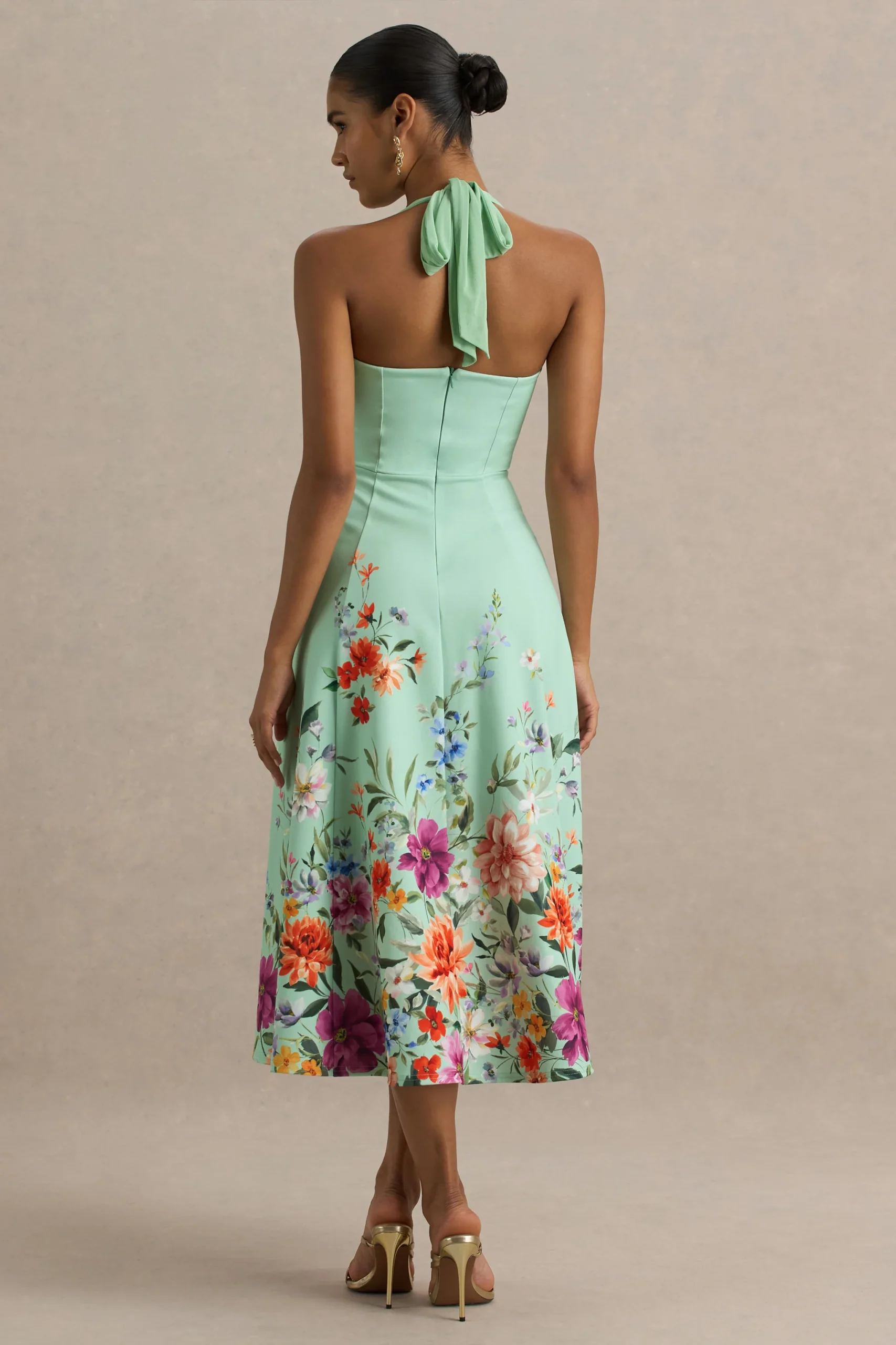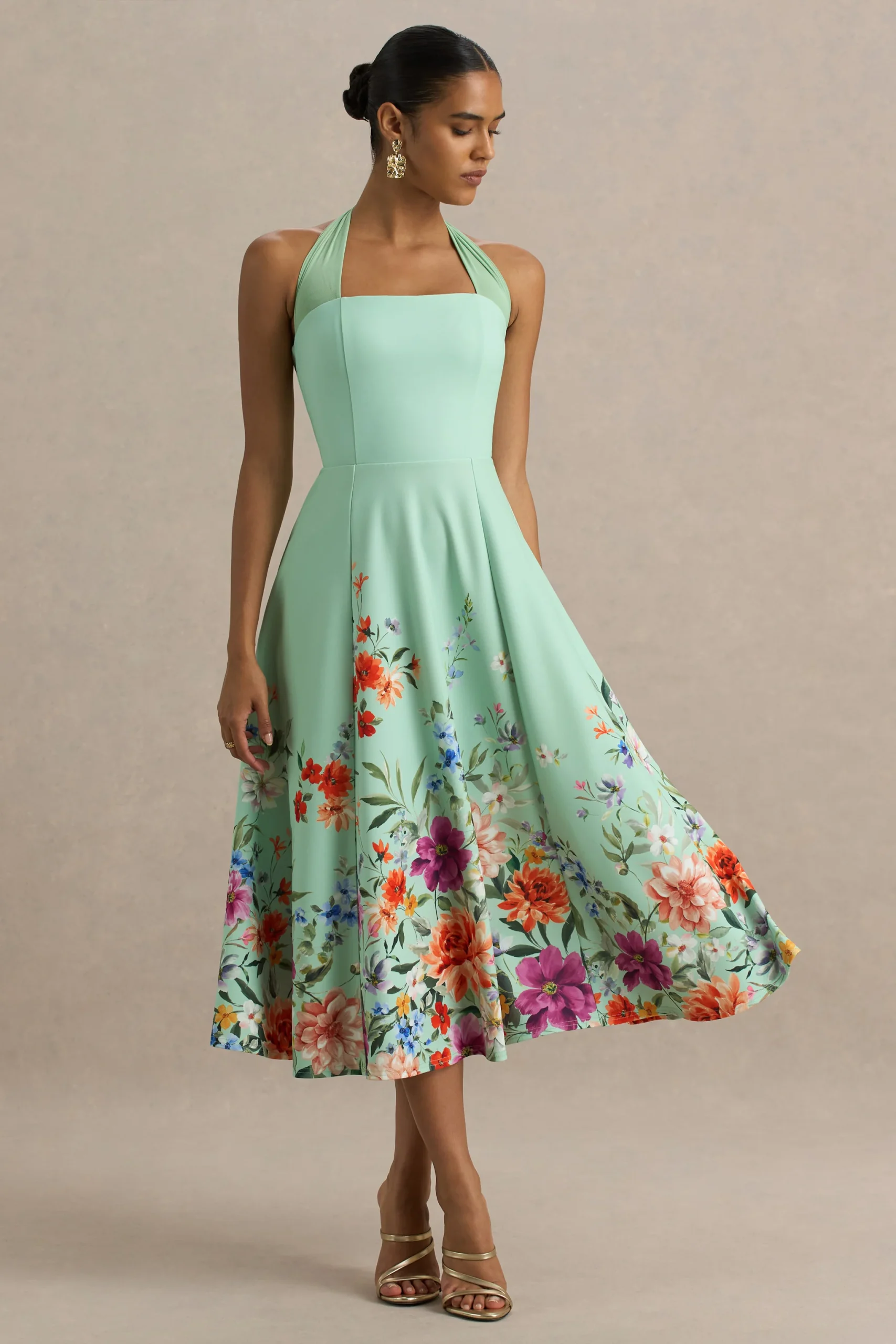 Una prenda imprescindible que destaca, Auburn es el vestido midi que toda chica necesita. Confeccionado con maestría en un crepé de scuba elástico premium, este vestido en estampado floral ubicado sobre fondo menta se realza con un escote halter de malla con lazada al cuello y una falda estilo skater de aire etéreo.