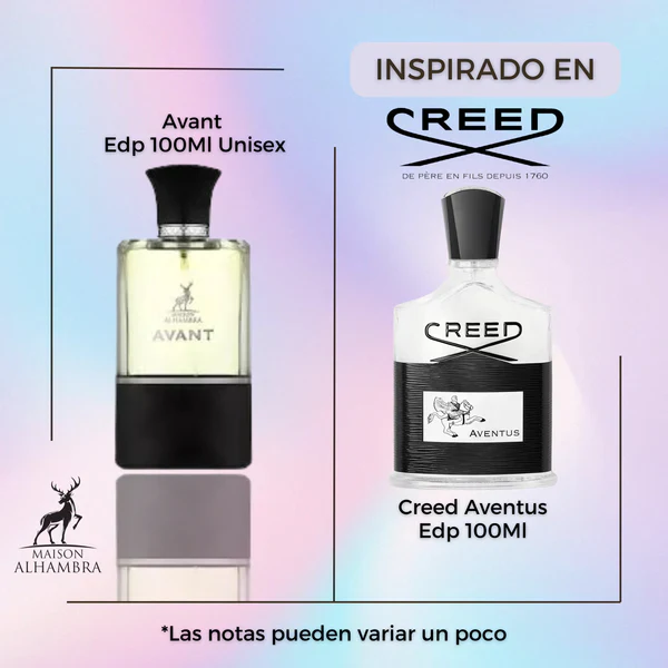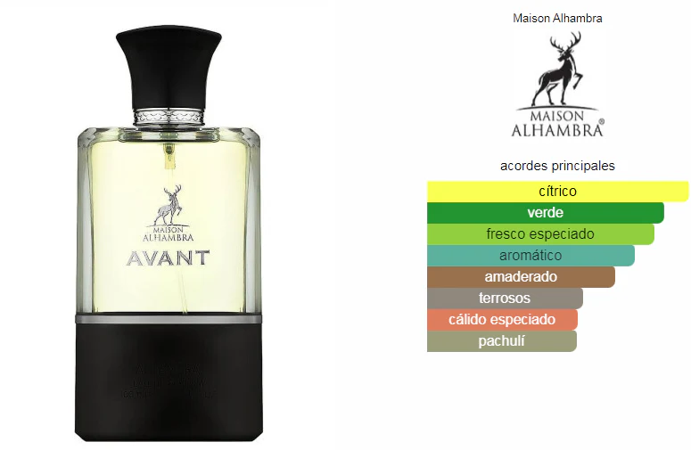 Avant de Maison Alhambra es una fragancia de la familia olfativa Aromática para Hombres. Avant se lanzó en 2022. Las Notas de Salida son notas verdes, bergamota y limón (lima ácida); las Notas de Corazón son pimienta negra, jazmín y lavanda; las Notas de Fondo son vetiver, pachulí y almizcle.