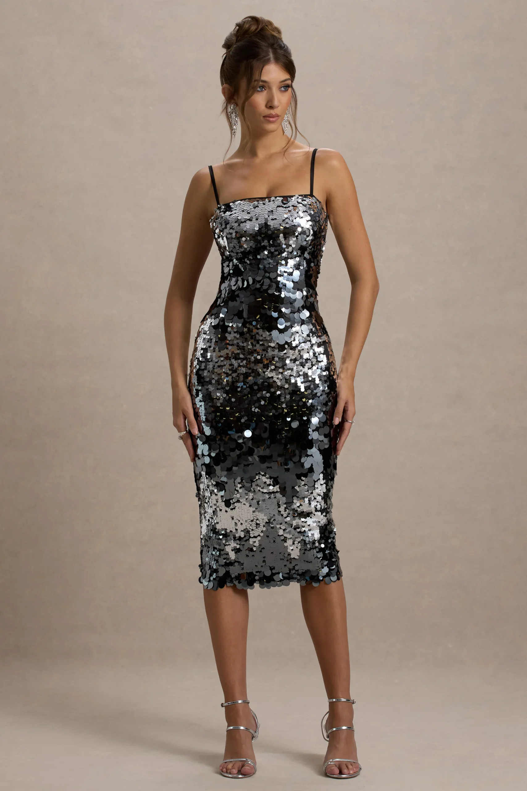 Diseñado para deslumbrar, agrega Azure a tu armario de fiesta esta temporada de eventos. Confeccionado en un resplandeciente mar de lentejuelas plateadas que crean un brillo similar al espejo, este vestido midi fue creado para lucir en la pista de baile. Con una espalda con cordones para un ajuste personalizado, combínalo con un peinado elegante para mostrar todo lo que Azure tiene para ofrecer.