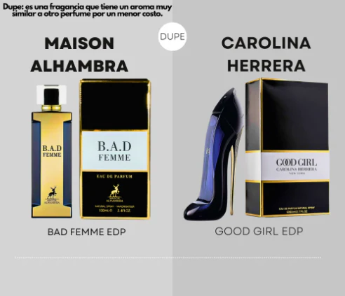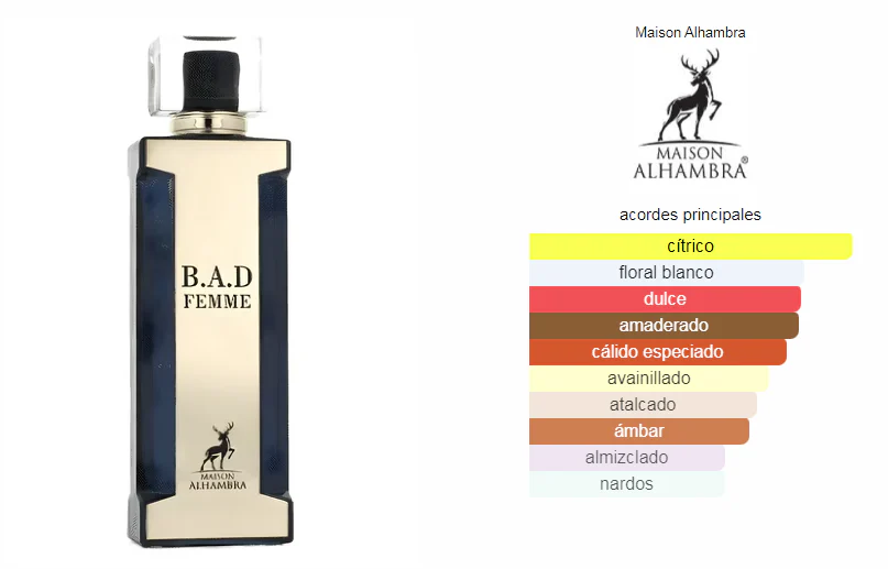 B.A.D. Femme de Maison Alhambra es una fragancia de la familia olfativa Floral Frutal Gourmand para Mujeres. B.A.D. Femme se lanzó en 2022. Las Notas de Salida son bergamota, almendra, café y limón (lima ácida); las Notas de Corazón son nardos, rosa de Bulgaria (rosa Damascena de Bulgaria), flor de azahar del naranjo, jazmín sambac (sampaguita) y raíz de lirio; las Notas de Fondo son haba tonka, vainilla, cacao, almizcle, madera de cachemira, sándalo, praliné, cedro, ámbar, pachulí y canela.