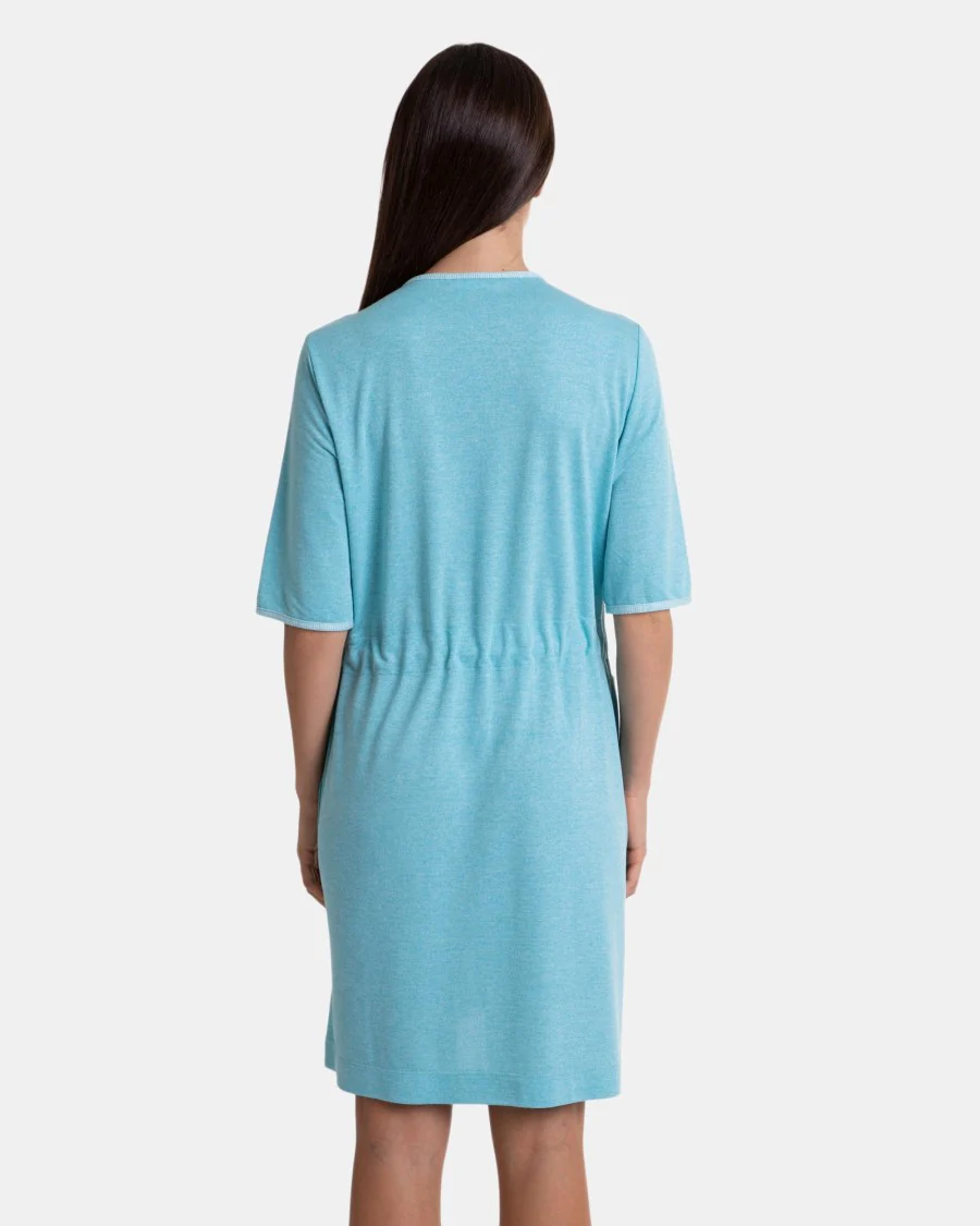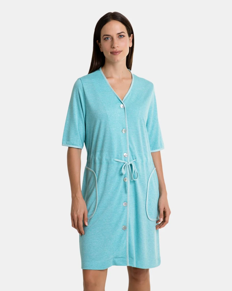 Bata de mujer en tejido de punto liso, manga francesa y abierta con cierre de botones y cinturón interior que ajusta por delante, tiene bolsillos laterales.
