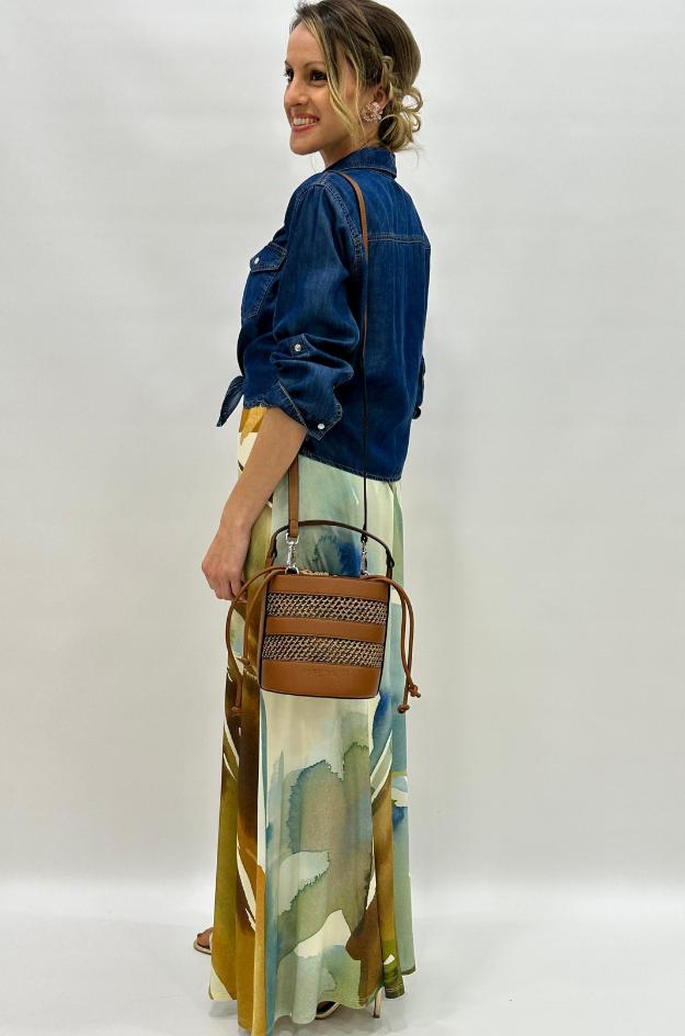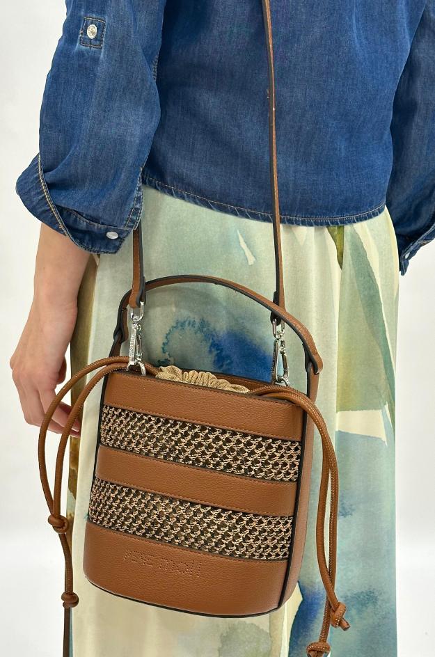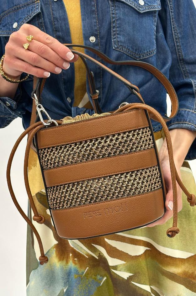 Bolso bombonera de la firma Pepe Moll confeccionado en material efecto piel de color cuero, con franjas decorativas en rafia trenzada. Su diseño compacto incluye cierre mediante cordón ajustable y una práctica bolsa interior tipo saco. Incorpora doble asa: una de mano y otra bandolera ajustable y extraíble, lo que permite llevarlo cómodamente al hombro o cruzado.