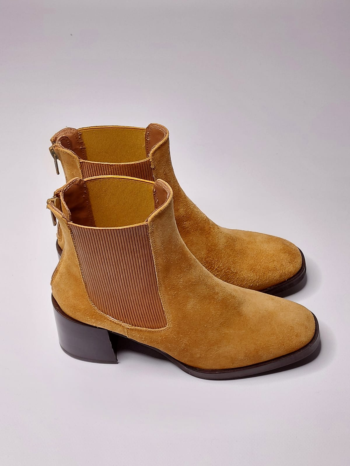 Botín en anteado Javiera de color mostaza con elásticos en ambos laterales cubiertos en piel como detalle, cremallera trasera. Interior todo en piel y plantilla almohadillada para mayor confort. Cremallera en talón. Tacón ancho acabado en suela.