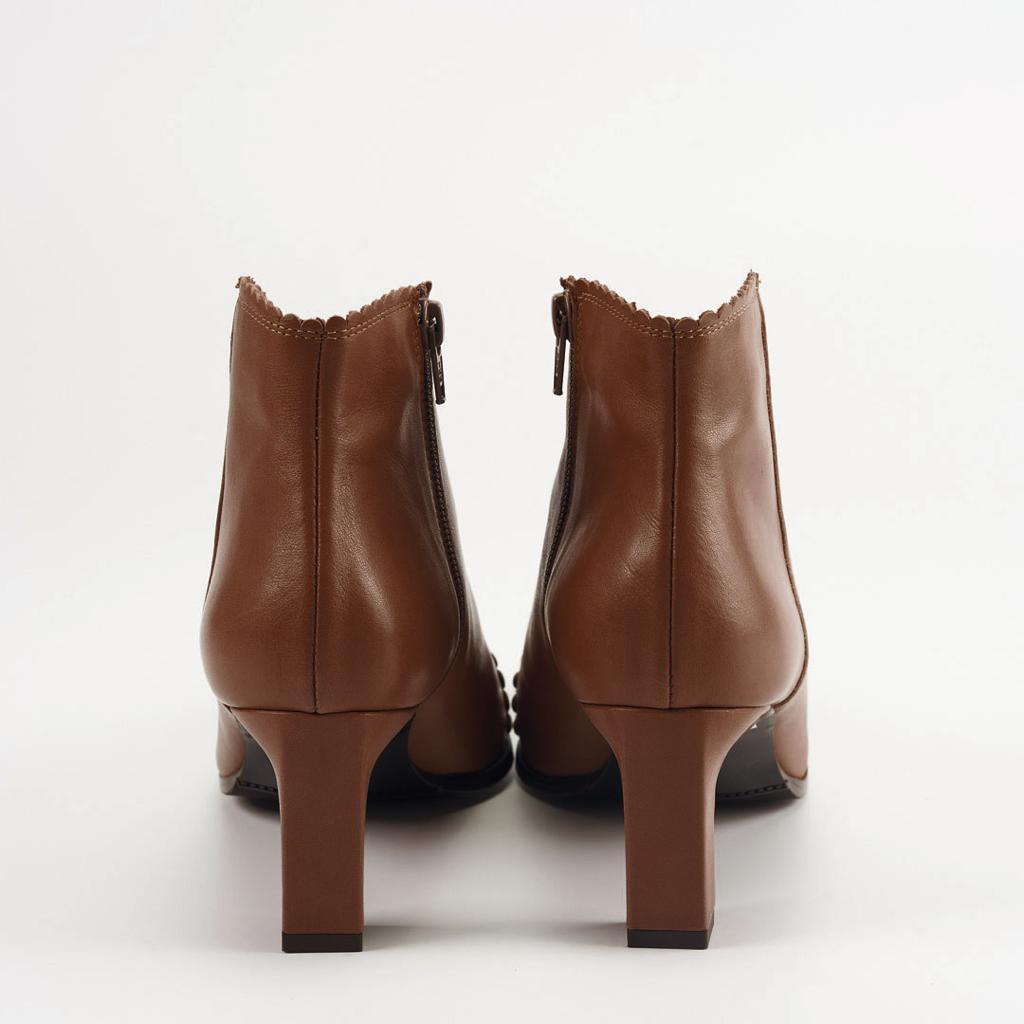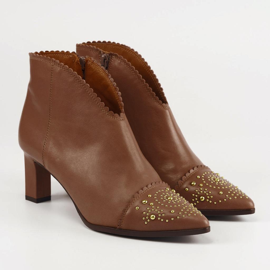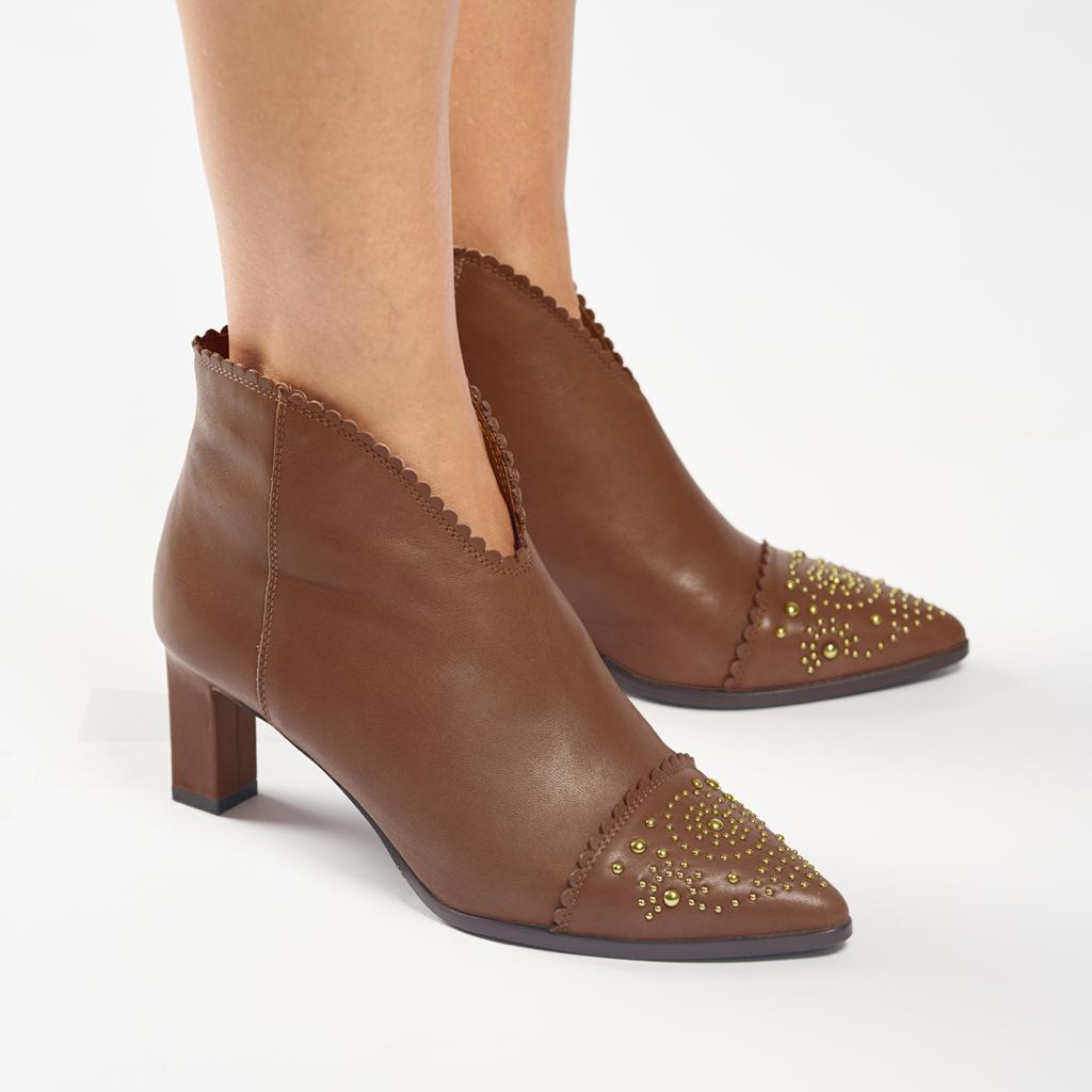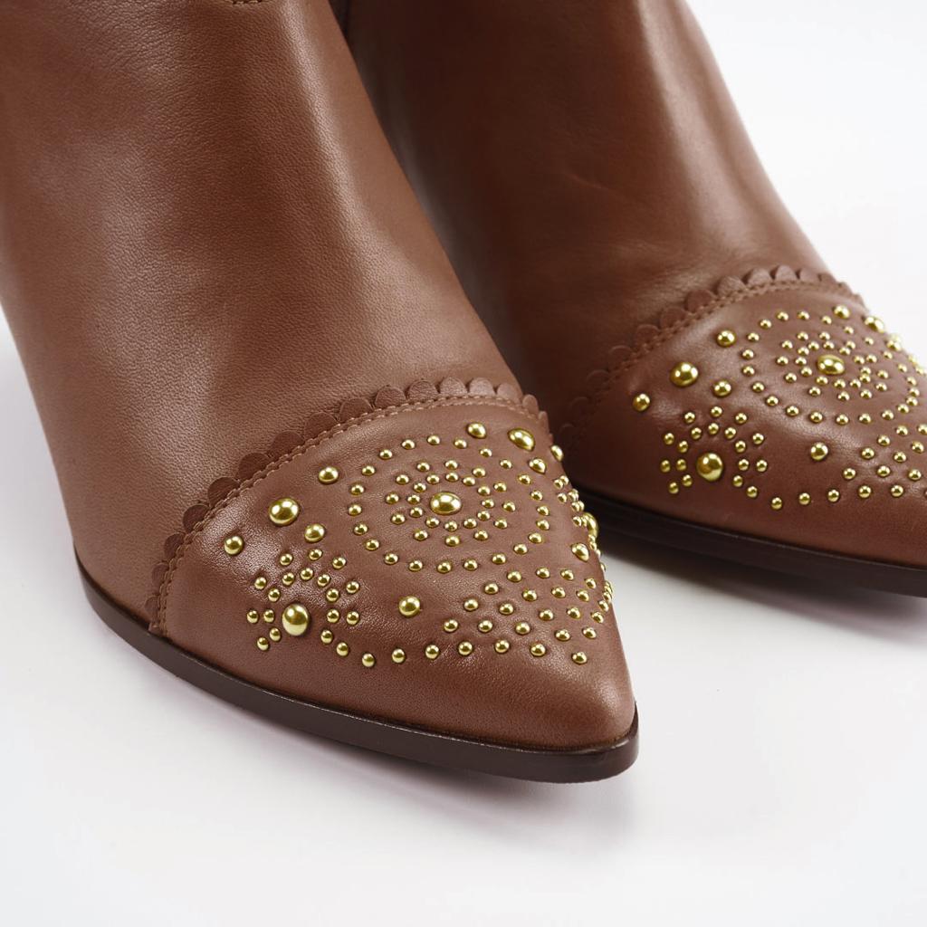 Botin pensado para combinar con cualquier estilismo. Fabricado en piel muy suave que hace que se adapte como una segunda piel. Los detalles del festón alrededor de la boca del botín y en la puntera le aporta dulzura, pero mezclado con los pequeños remaches en diferentes tamaños formando un dibujo, lo hacen roquero.