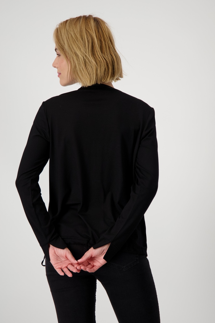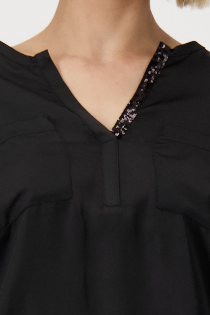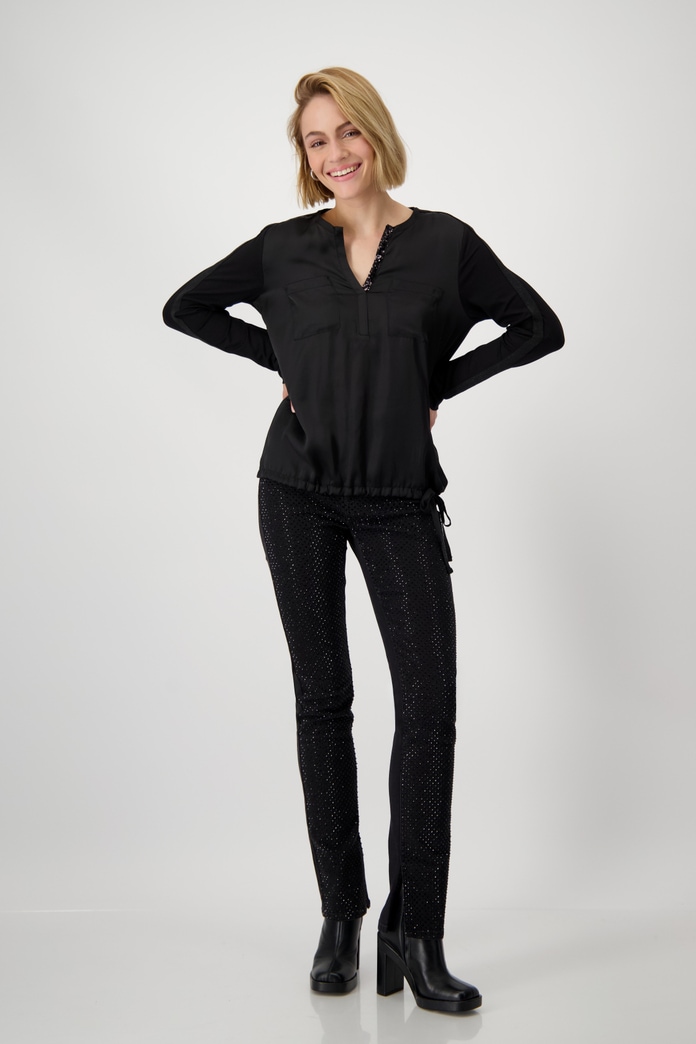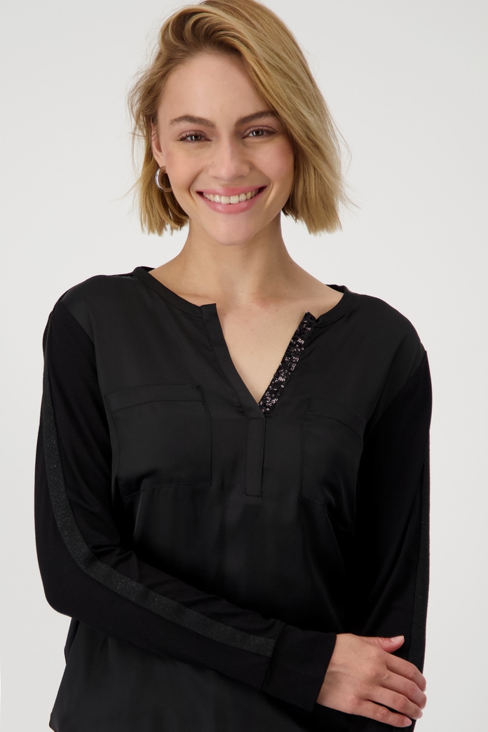 Blusa Monari con un diseño que combina la sofisticación de una blusa en la parte delantera y la comodidad de una camisa en la parte trasera. Confeccionada en un tejido de viscosa suave, cuenta con detalles como una banda de lúrex en las mangas, bolsillos de parche en el pecho, escote redondo adornado con lentejuelas y puños con abertura. Su dobladillo con banda asegura un ajuste perfecto, convirtiéndola en una prenda versátil y elegante para cualquier ocasión.