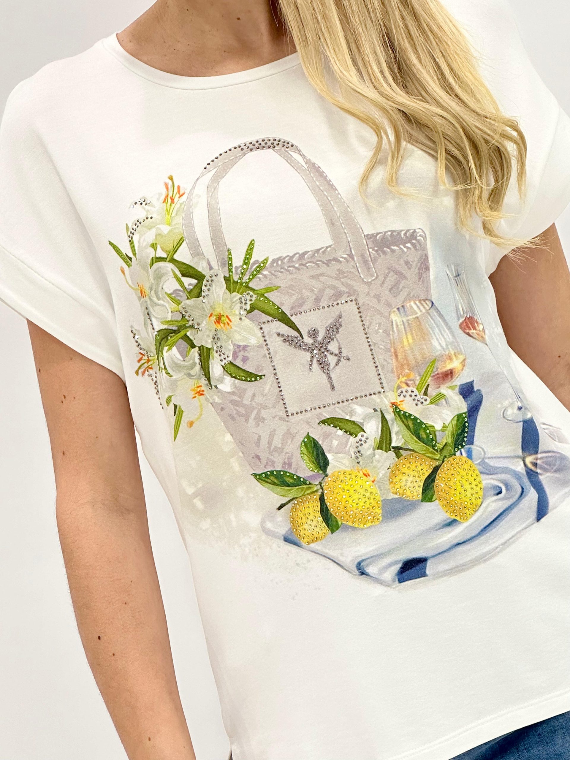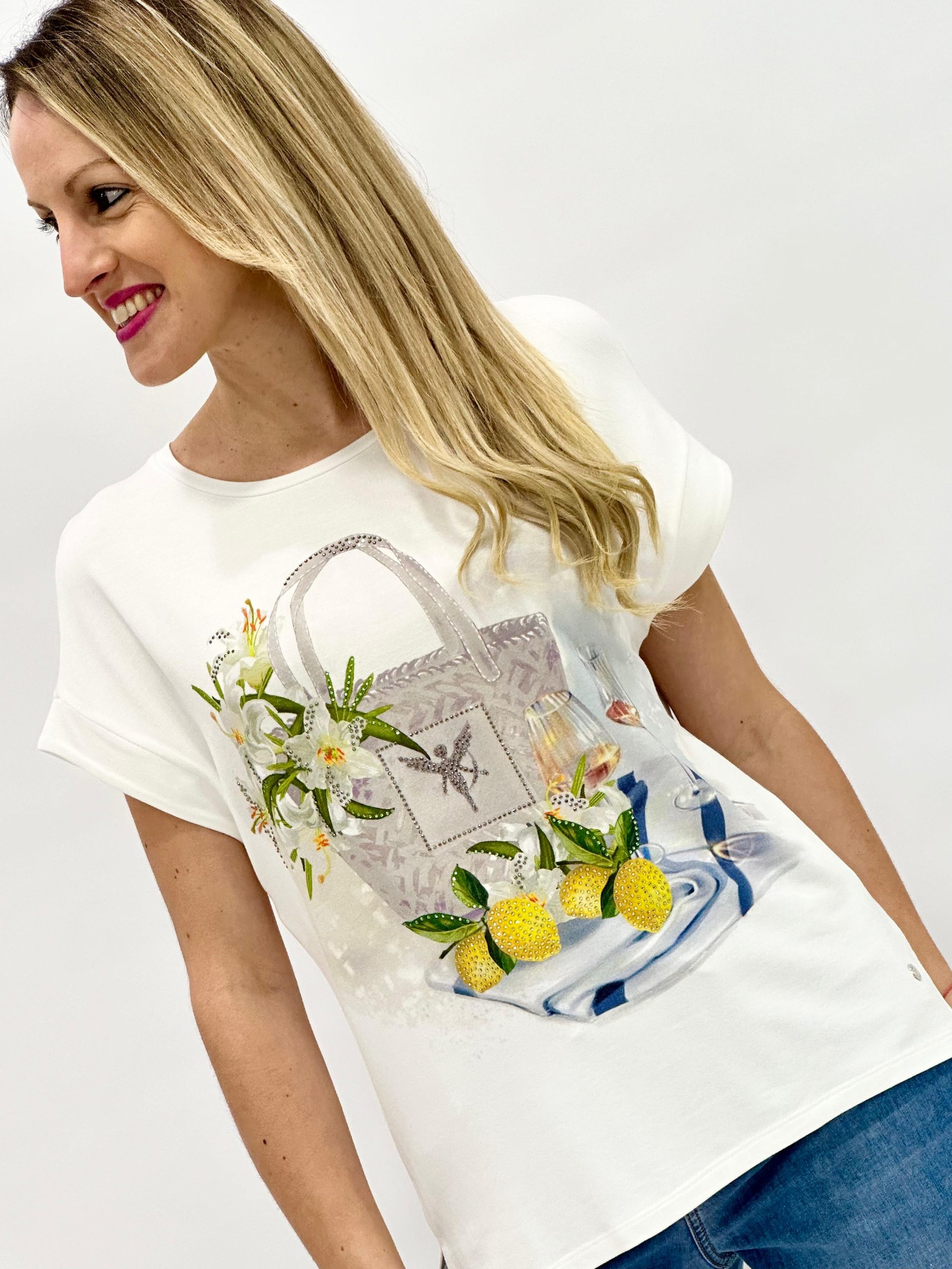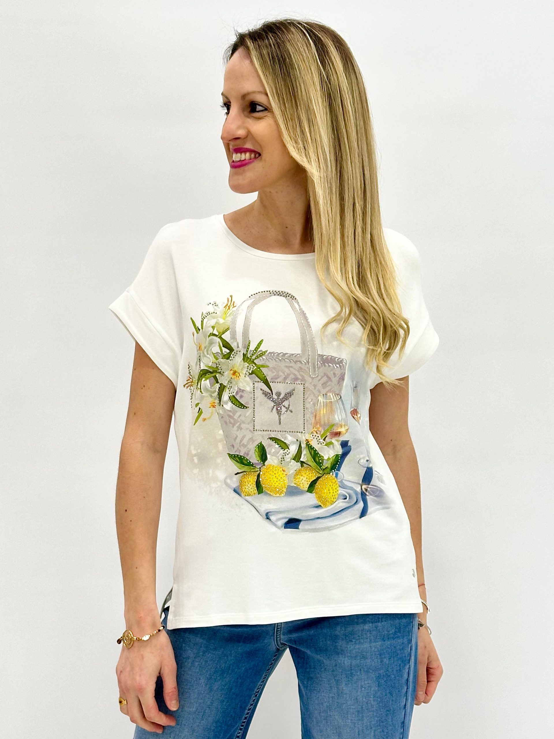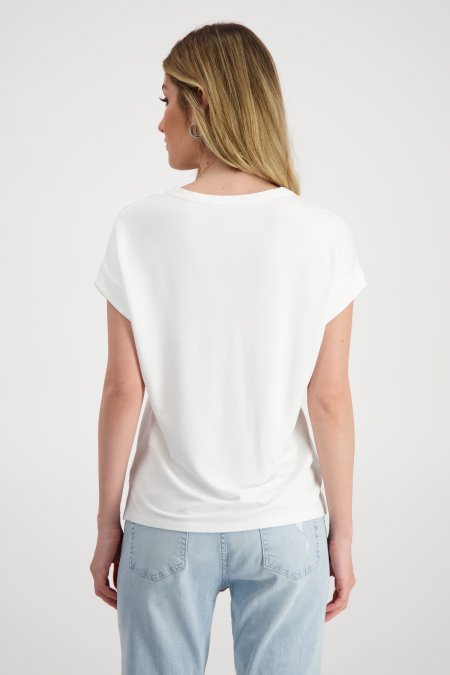 Camiseta de Monari confeccionada en material elástico con mezcla de viscosa de alta calidad. Detalle estampado fotográfico y pedrería en la parte delantera y aberturas laterales. Presenta un ajuste regular, cuello redondo y mangas cortas sobrecortadas con puño, ideal para un estilo moderno y sofisticado.