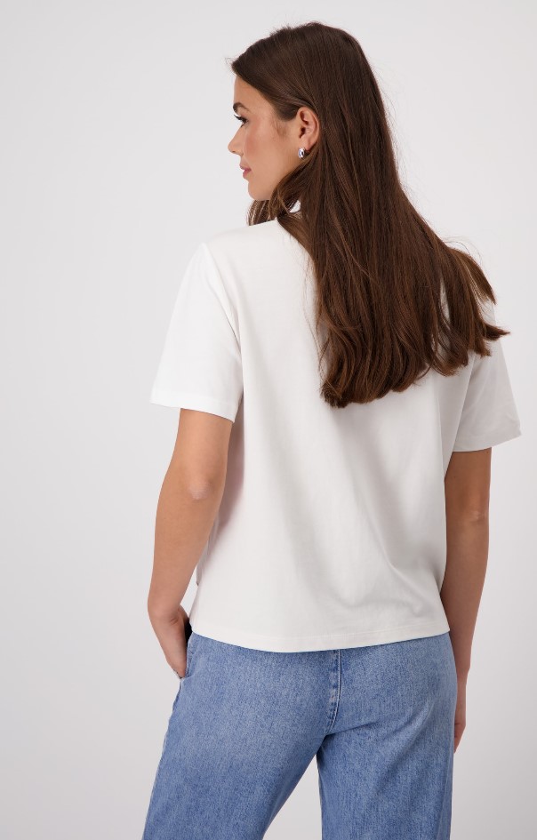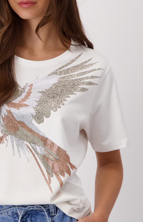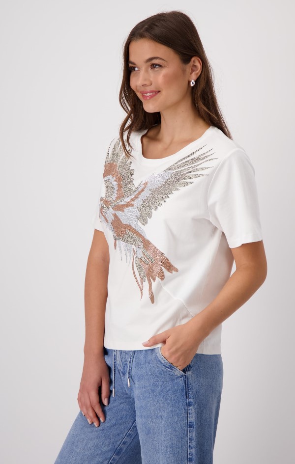 Esta camiseta presenta un estampado de loro único adornado con diamantes de imitación brillantes. La mezcla de algodón y modal garantiza un ajuste cómodo.
