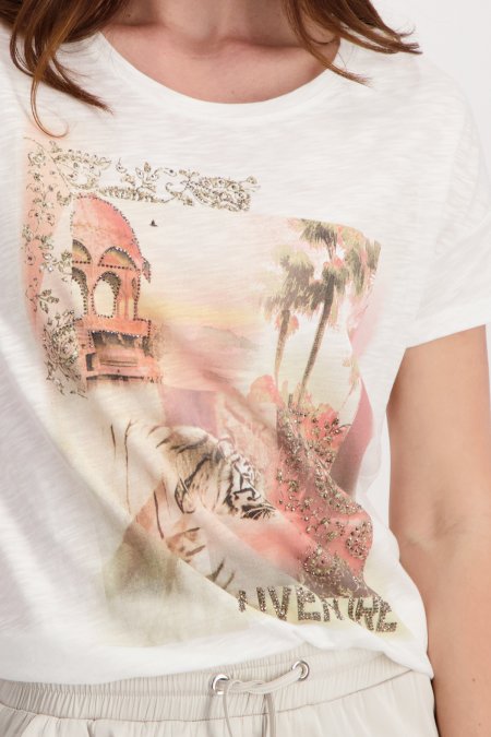 Camiseta de Monari confeccionada en tejido de mezcla de algodón de alta calidad y su llamativo estampado de tigre con escritura de strass aporta un toque de glamour. Presenta un ajuste regular, cuello redondo y mangas cortas sobrecortadas, ideal para un estilo moderno y sofisticado.