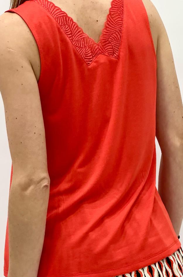 Camiseta sin mangas de la firma Lola Espeleta. Confeccionada en tejido de punto suave y elástico, esta prenda presenta escote en pico con detalle de encaje a tono que aporta un toque decorativo sin recargar. Corte recto que se adapta con comodidad al cuerpo.
