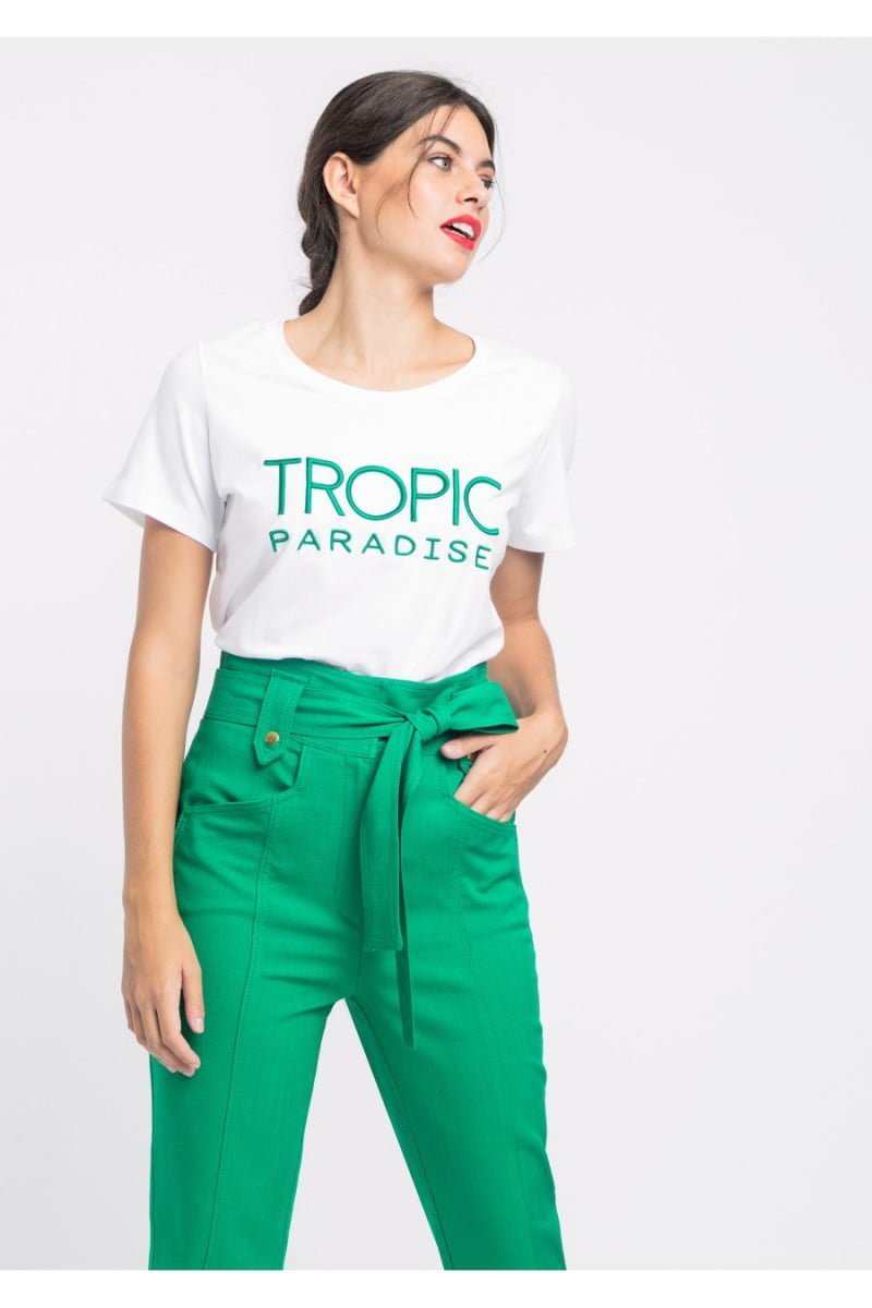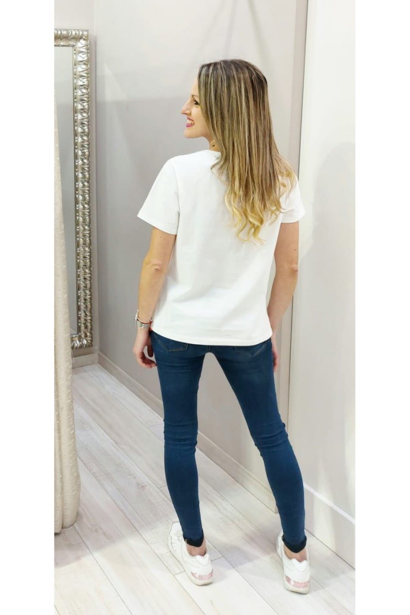 Camiseta de manga corta con detalle en delantero de Alba Conde. Escote redondo, corte semientallado y bajo recto.