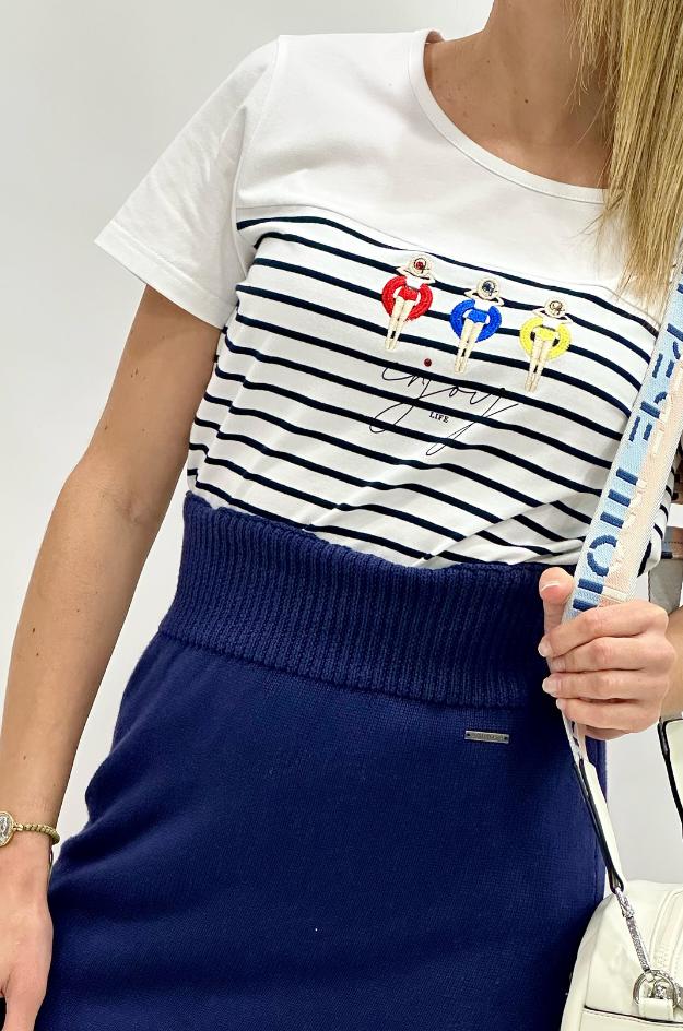 Camiseta blanca de rayas marineras de Ananke con detalle bordado de bañistas y pedrería.