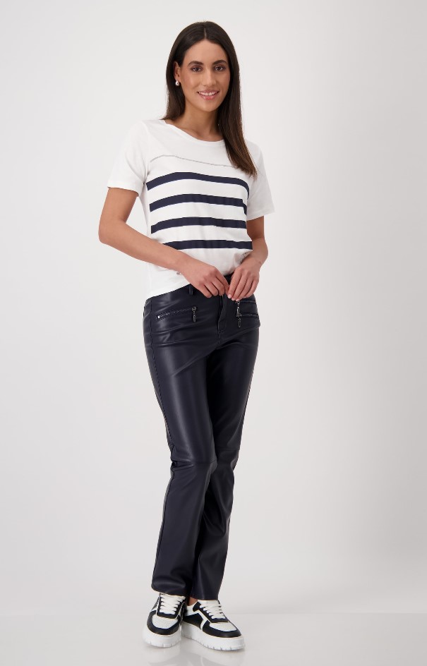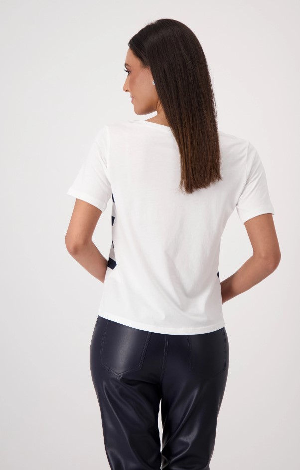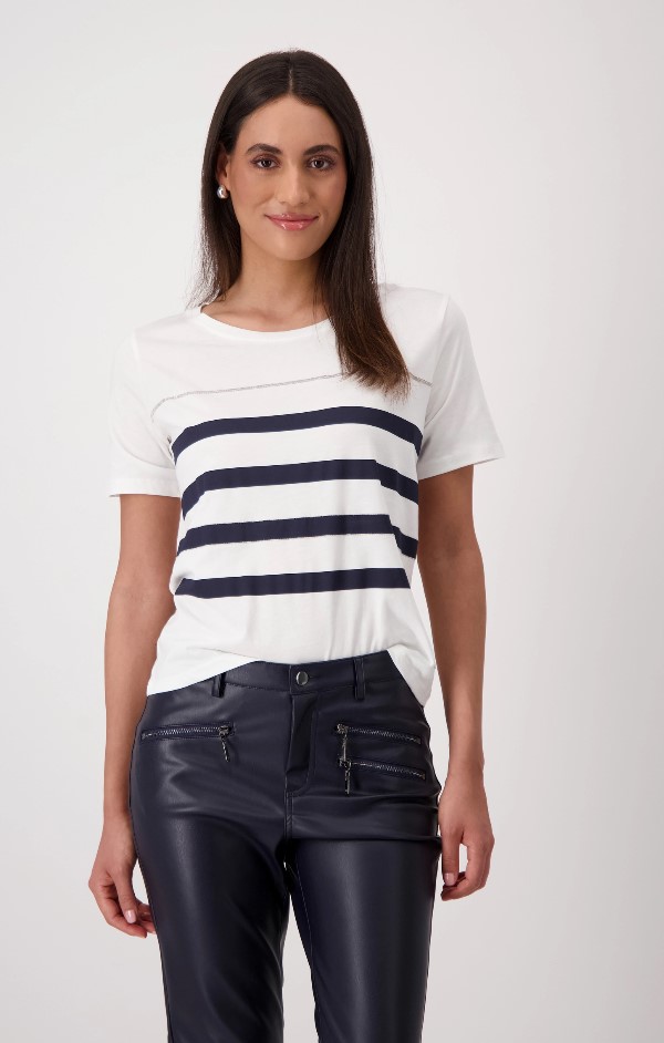 El estampado de rayas atemporal y las elegantes joyas hacen de esta camiseta un auténtico punto de atracción.