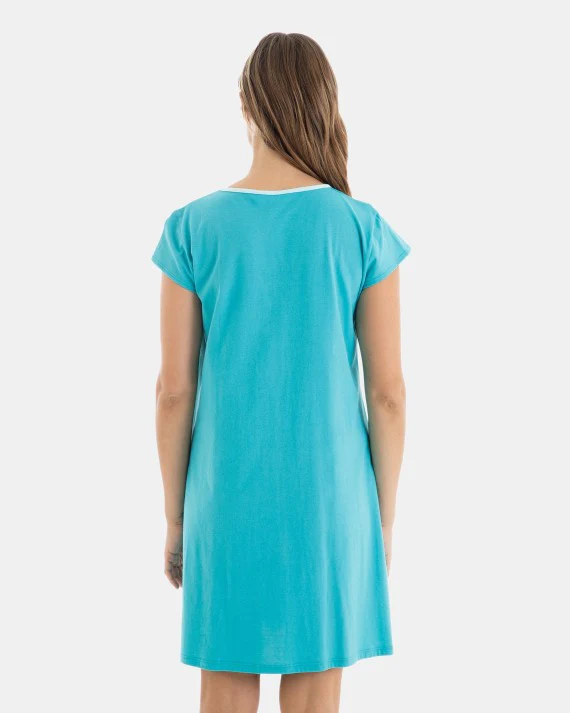 Camisón de mujer de tejido punto algodón, estampado posicional en bajo prenda, manga corta, tapeta delantera con botones y escote redondo