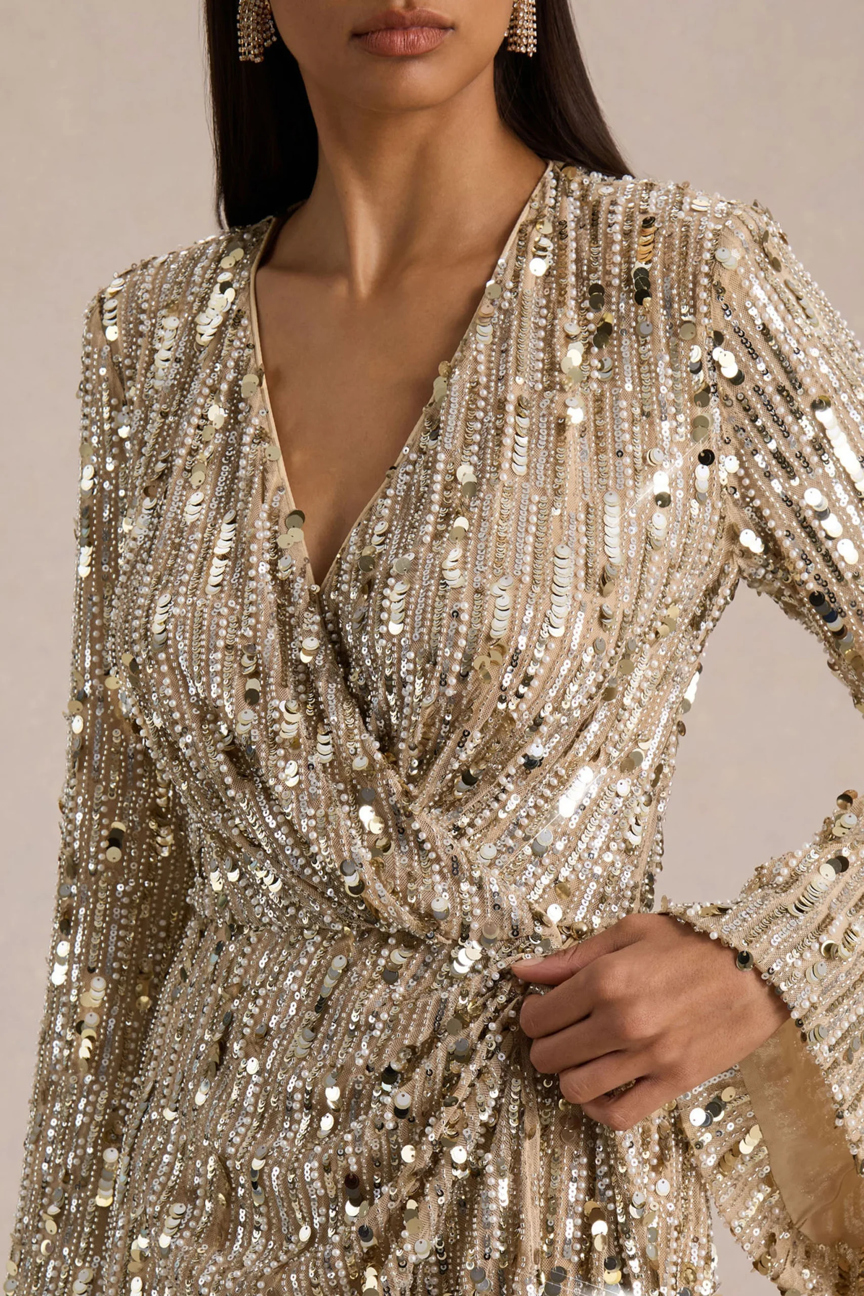 Te presentamos a Carmina, el mini que acapara todas las miradas. Confeccionado en nuestras lentejuelas premium doradas, este vestido mini cruzado brilla con cada movimiento, esculpiendo la silueta de manera favorecedora y sin esfuerzo. El escote profundo aumenta el atractivo, mientras que las mangas acampanadas aportan un toque divertido y dramático. Carmina es pura energía de fiesta, pensado para noches que exigen protagonismo.