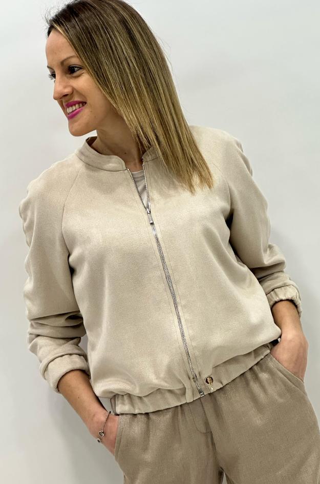 Bomber de la marca Piluca Barrero en tono beige. Presenta cierre frontal con cremallera metálica, cuello redondo estilo mao, mangas raglán y puños elásticos. El bajo ajustado proporciona una silueta estructurada sin renunciar a la comodidad.