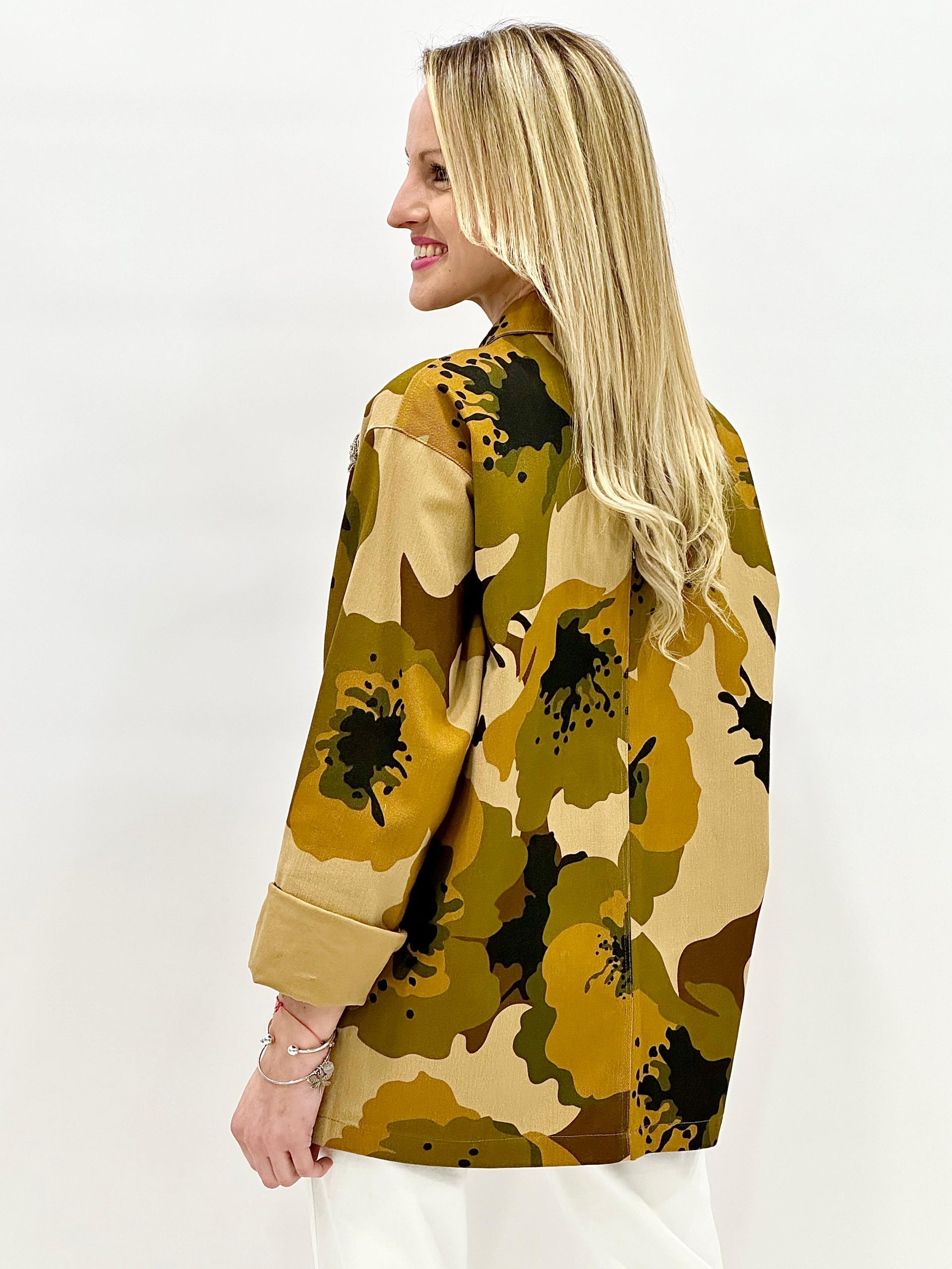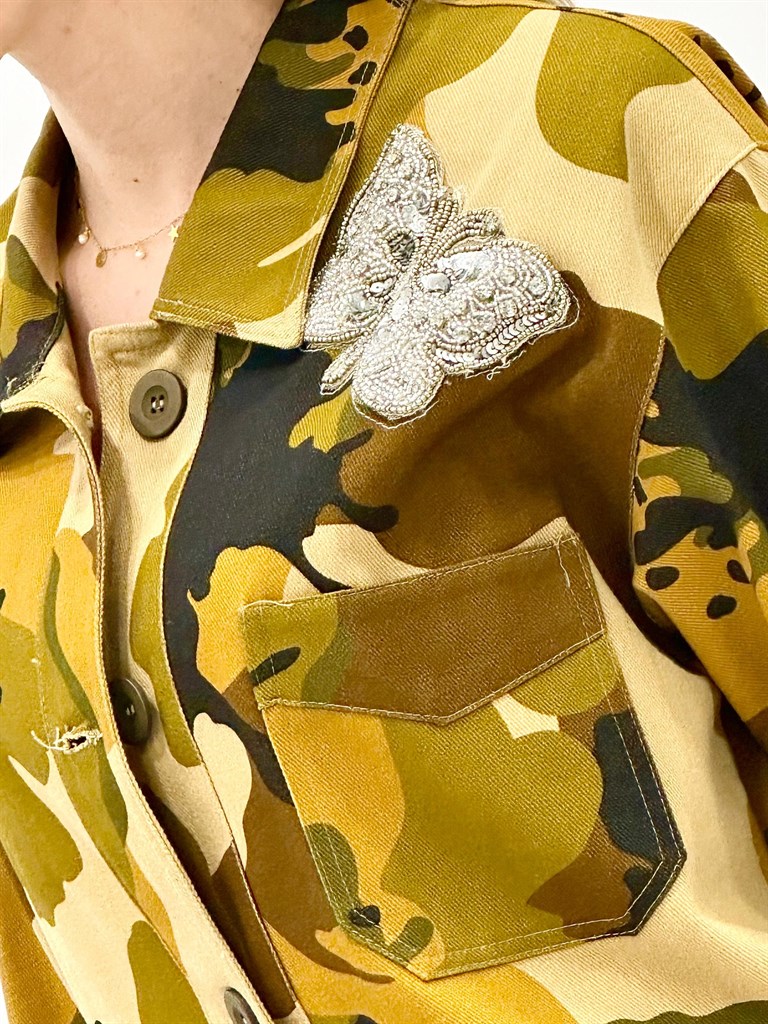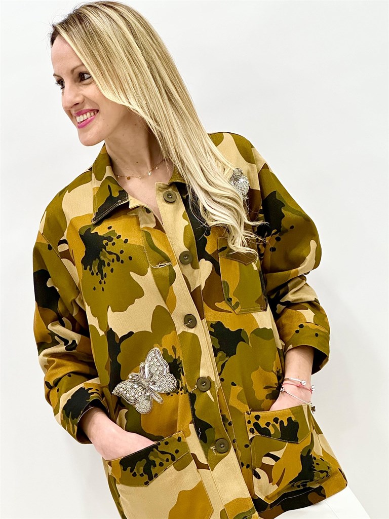 Cazadora de corte amplio estampado militar de Dixie color verde. Cuello camisero y manga larga acabada con puños abotonados. Bolsillos de parche delanteros. Cierre con botonadura delantera. Detalle de mariposas en el frontal.