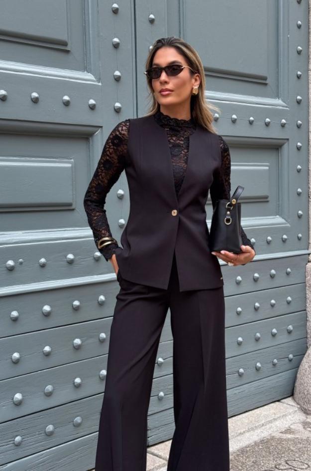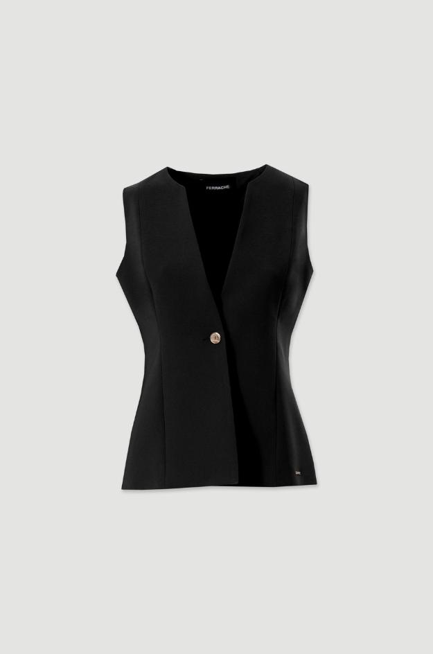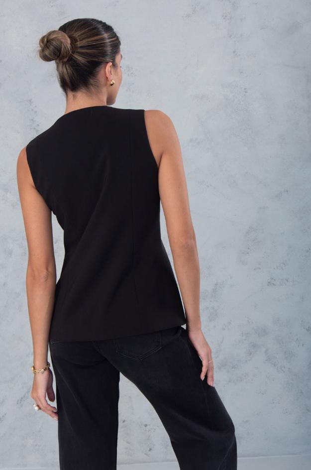 Chaleco estructurado entallado. Su corte sin mangas y el escote en pico profundo estilizan la figura, aportando un toque femenino y sofisticado. El botón metálico personalizado con logotipo añade un detalle distintivo, reflejo del cuidado por los acabados de calidad.