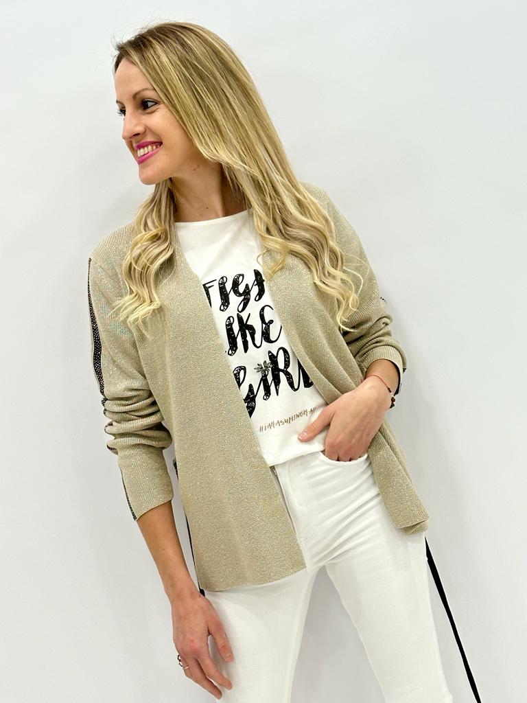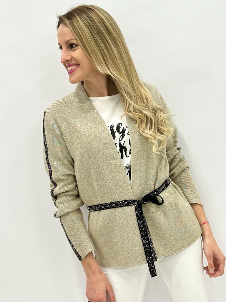 Chaqueta de punto abierta de Monari color beige con corte recto y manga larga. Detalle de elegantes letras brillantes y letras metalizadas en la parte delantera. Cinturón del misto tejido en color negro a juego con la banda de las mangas.