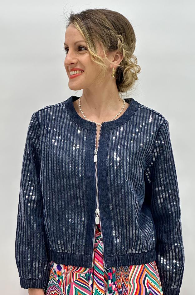 Chaqueta de tejido denim en tono azul marino de Monari, decorada con lentejuelas cosidas en líneas verticales que aportan un brillo discreto. Cuello redondo, cierre frontal con cremallera metálica y puños y bajo con acabado elástico que asegura comodidad y ajuste.