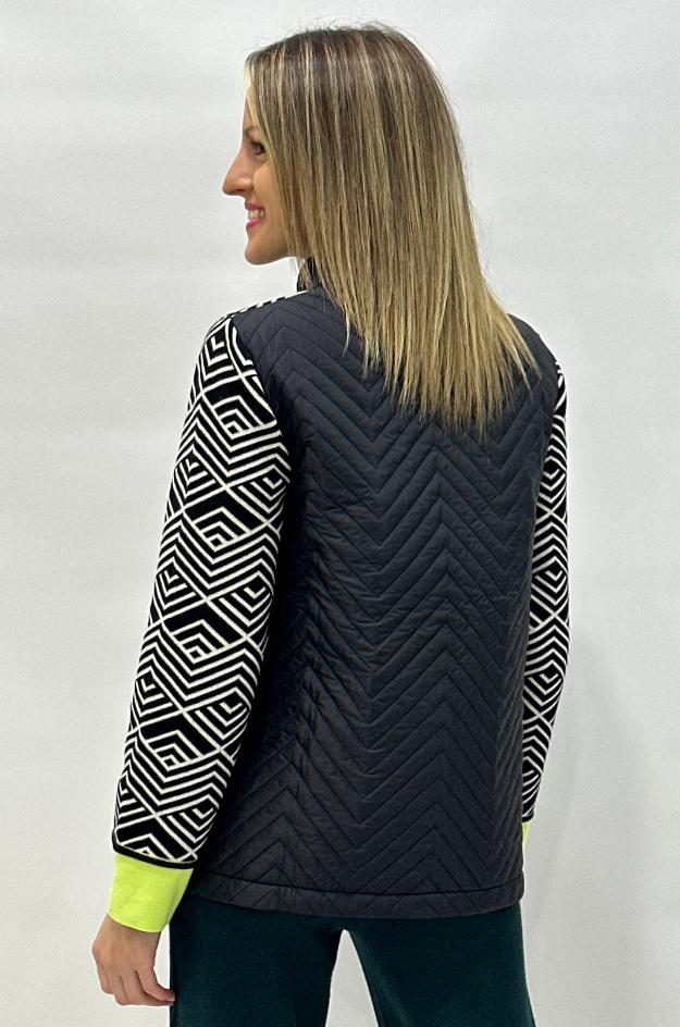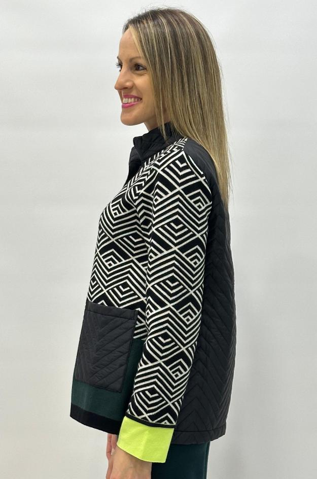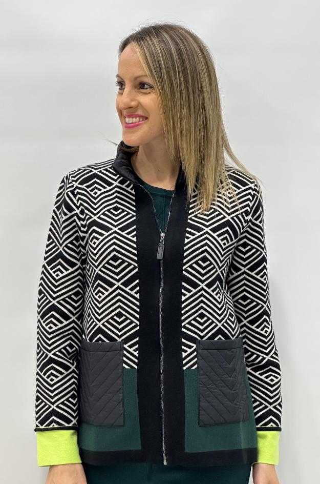 Chaqueta de punto con un diseño geométrico en jacquard que combina modernidad y comodidad en una misma prenda. Destaca por sus bolsillos frontales acolchados tipo puffy, que aportan un toque actual y diferenciado. Presenta cierre con cremallera, cuello subido y un bajo en contraste que estiliza la figura.