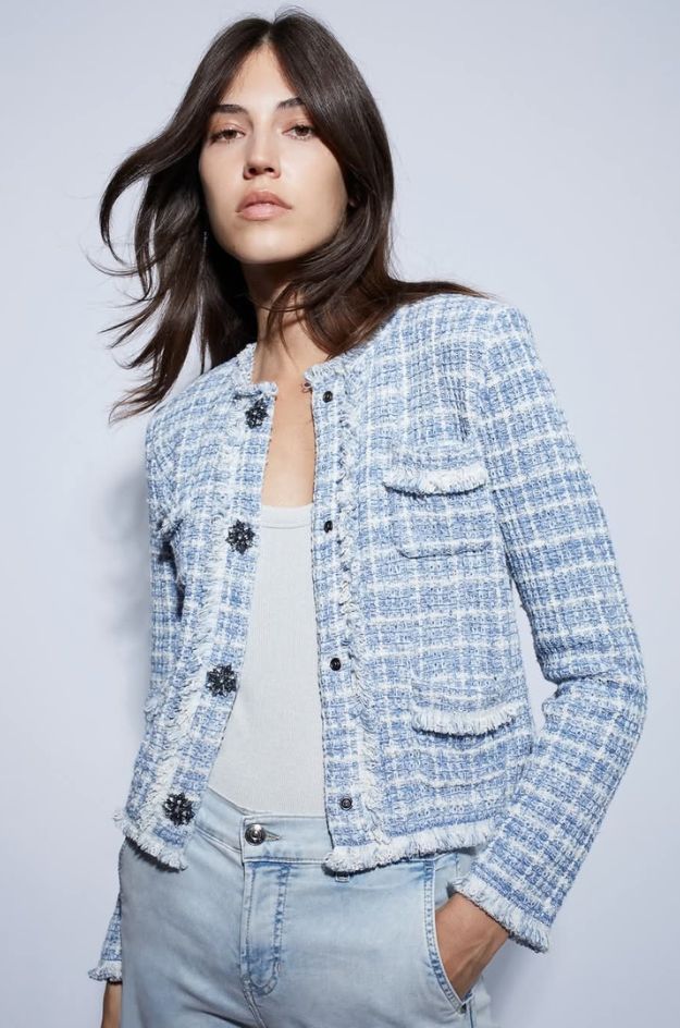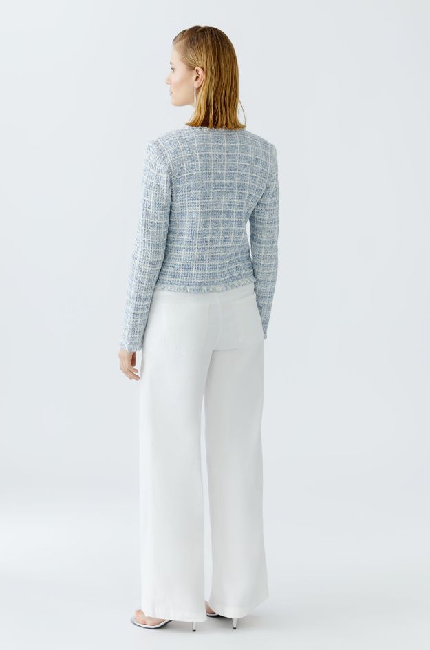 Chaqueta OUI de corte amplio confeccionada en punto estructurado en tonos azul claro y blanco. Presenta un diseño cómodo y ligero, con manga caída, cuello en pico y cierre frontal con botones.