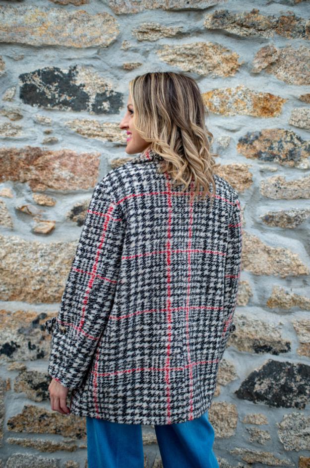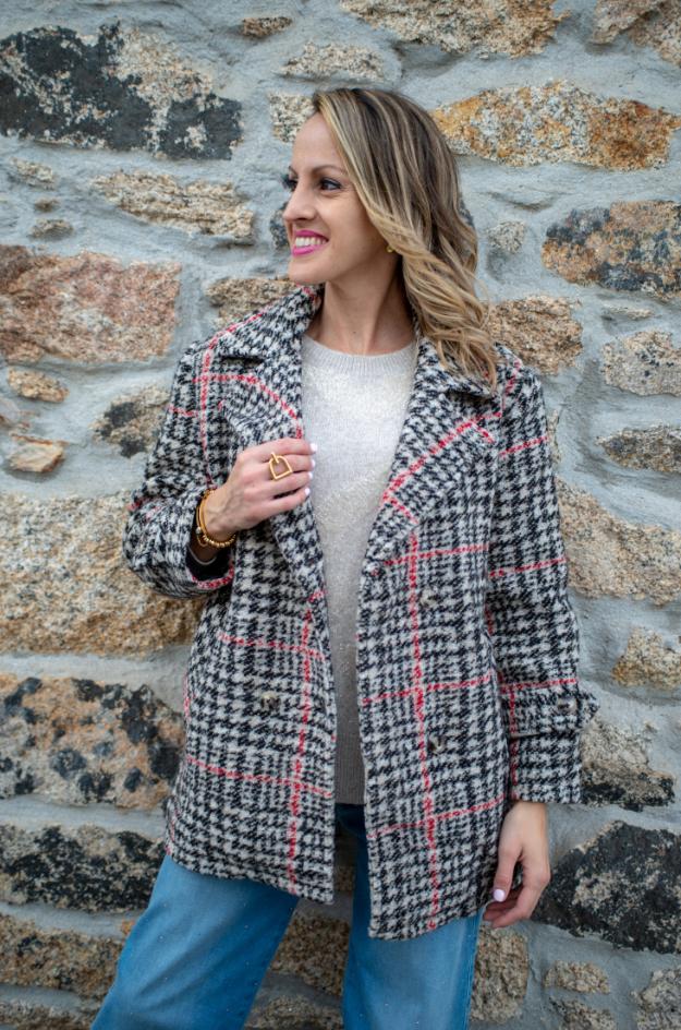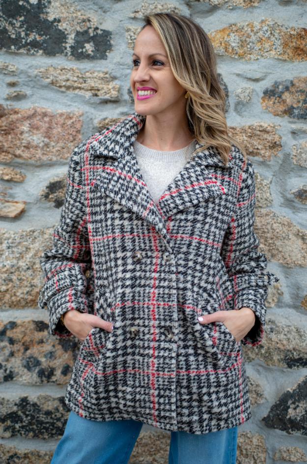 Abrigo de cuadros de la marca Escorpion. Un clásico diseño corto de tweed que combina elegancia y calidez, ideal para la temporada de otoño e invierno.