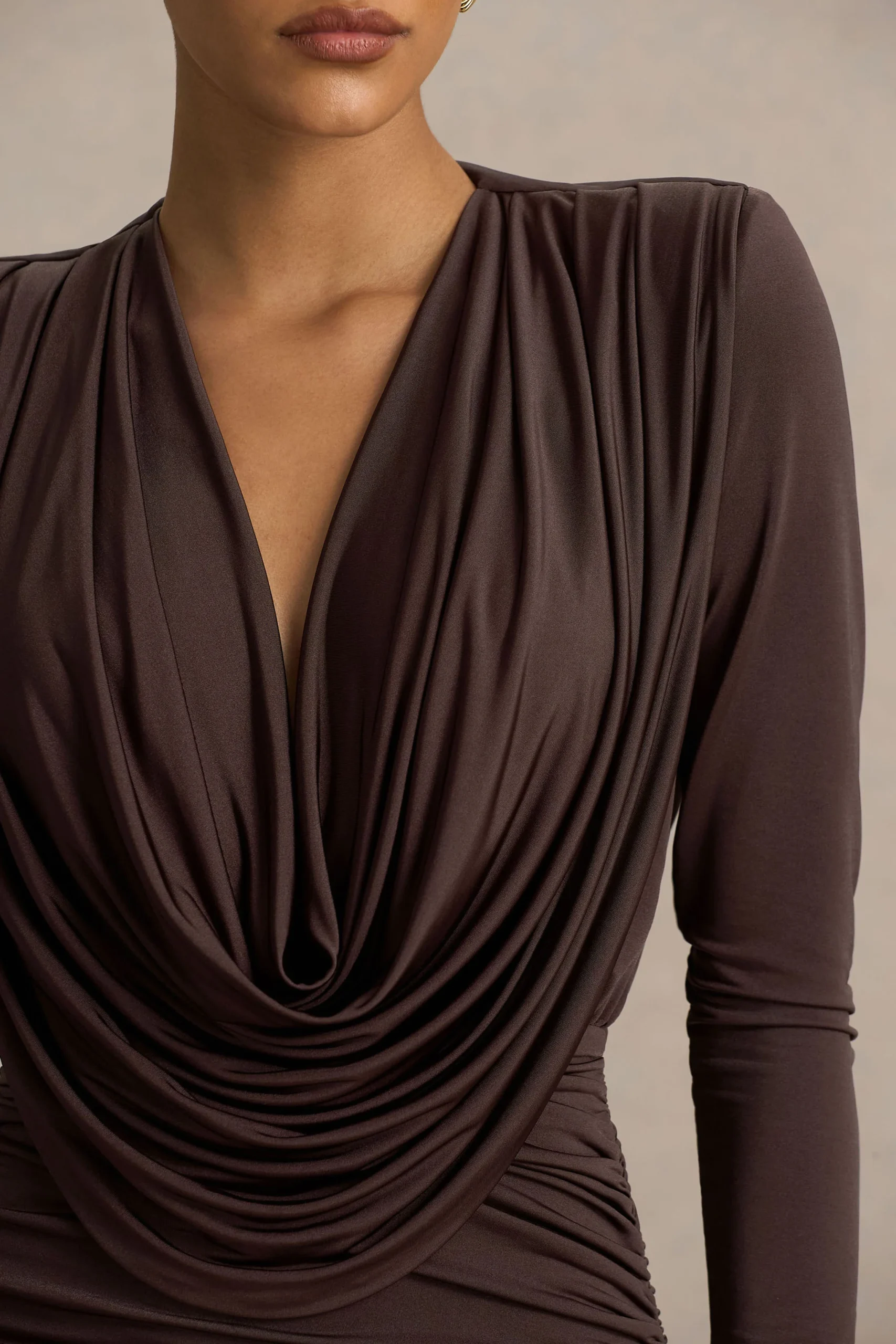 Adueñate de la noche con Ciela, una pieza atrevida diseñada para brillar. Confeccionado en nuestro disco jersey premium en tono marrón, este vestido mini está pensado para acaparar miradas en cualquier lugar. Presenta un profundo escote en V y unas hombreras estructuradas que aportan un aire de elegancia moderna. Rematado con una falda fruncida que se ajusta a la figura con perfección, Ciela es el look de fiesta definitivo de la temporada.