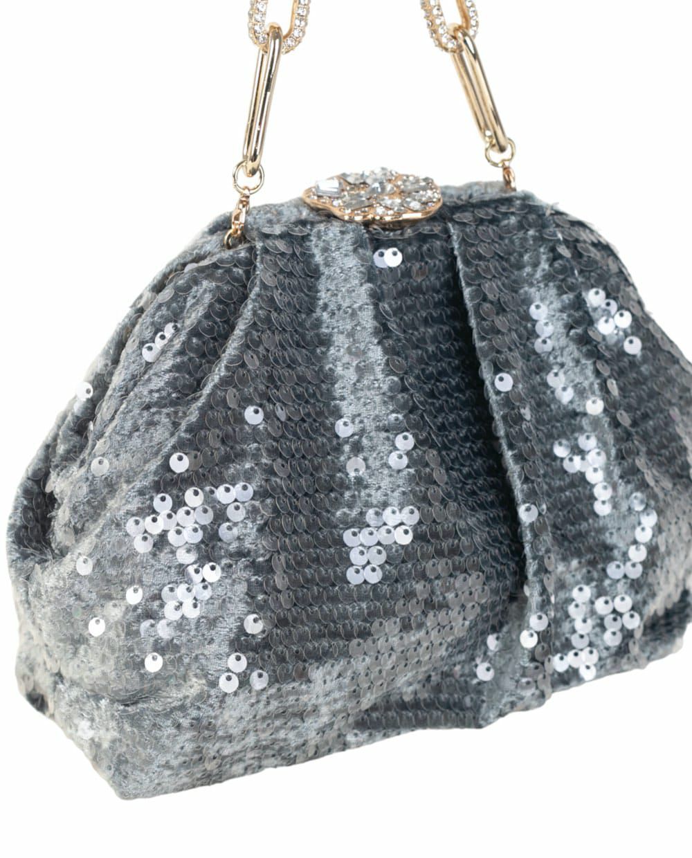 Clutch de terciopelo gris cubierto de lentejuelas. Con asa y tabatier de fantasía. Boquilla forrada.
