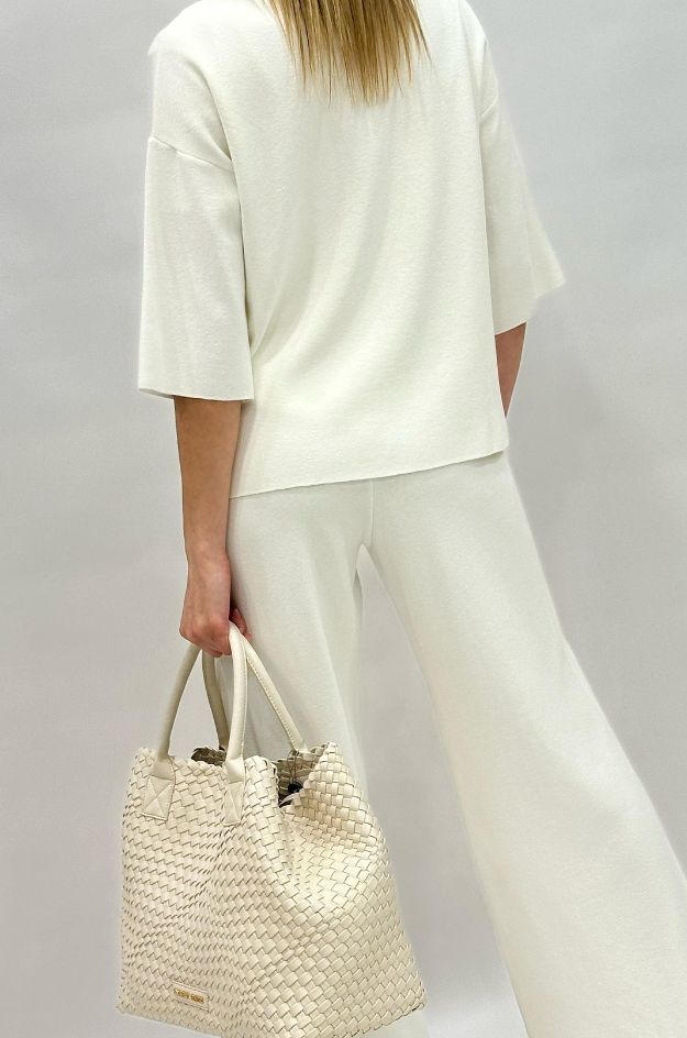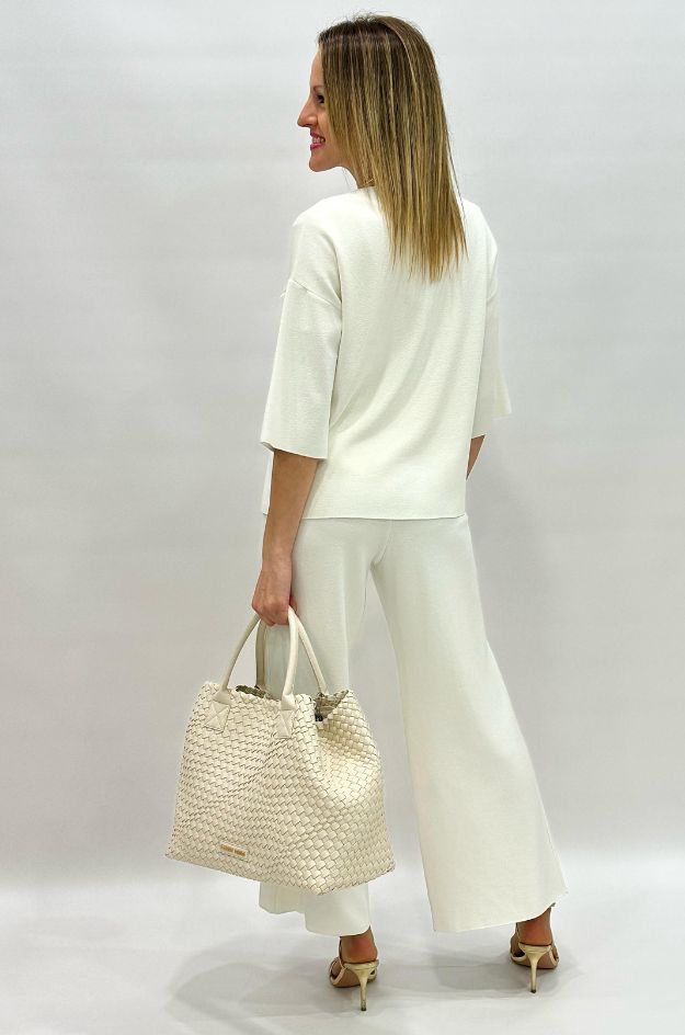 Conjunto de punto de la marca Alba Conde formado por pantalón con cintura elástica y chaqueta. Confeccionado en una mezcla de 69% viscosa, 29% poliacrílico y 2% elastán, que aporta suavidad y elasticidad. Corte amplio, con ajuste holgado que proporciona mayor comodidad y tallaje generoso.