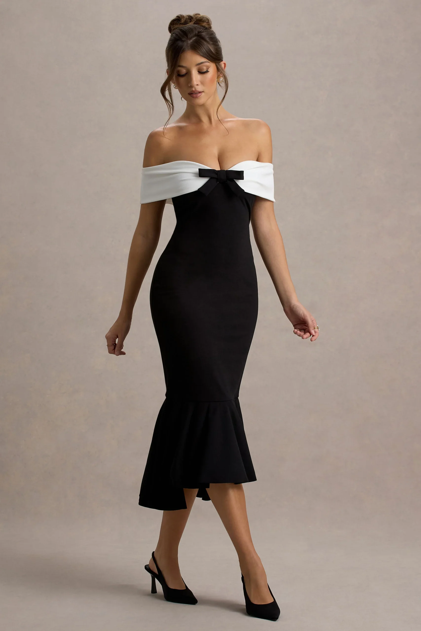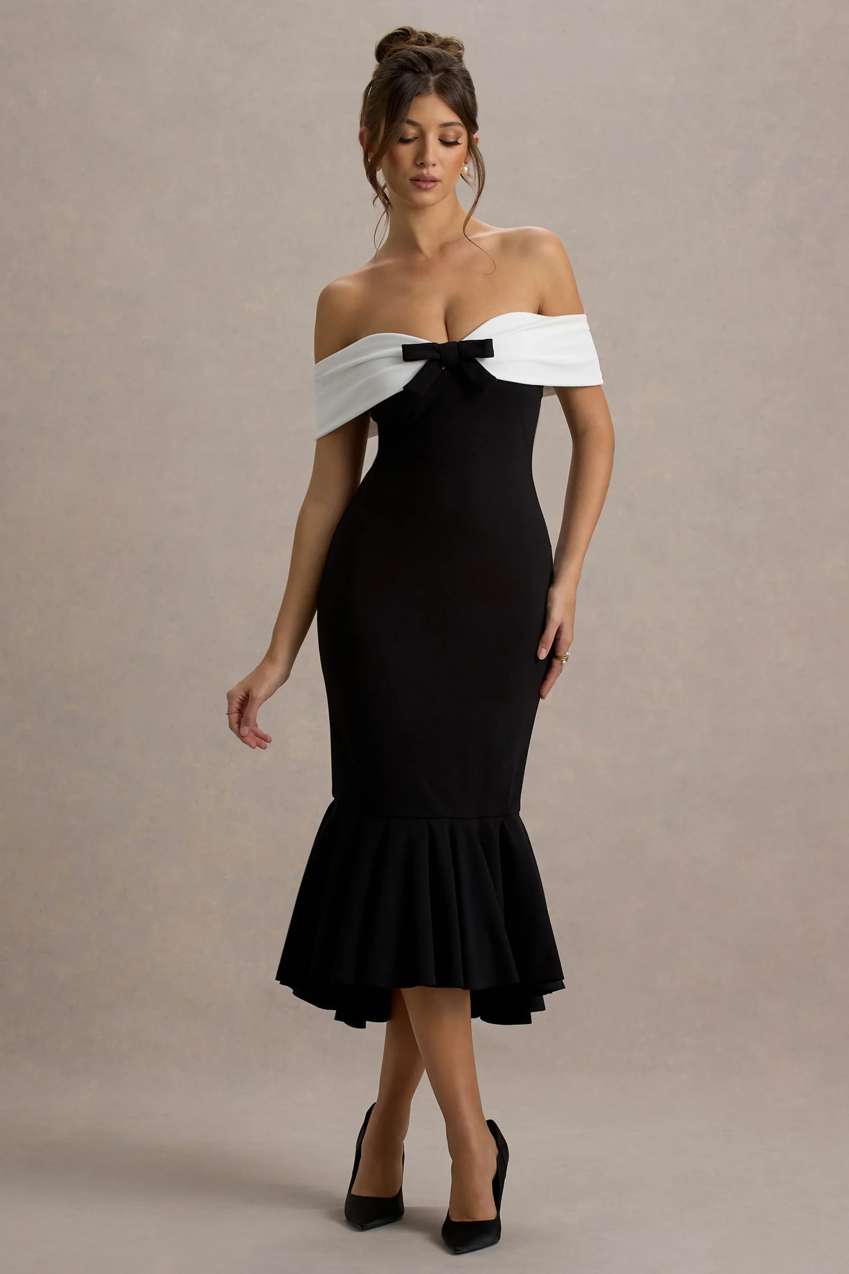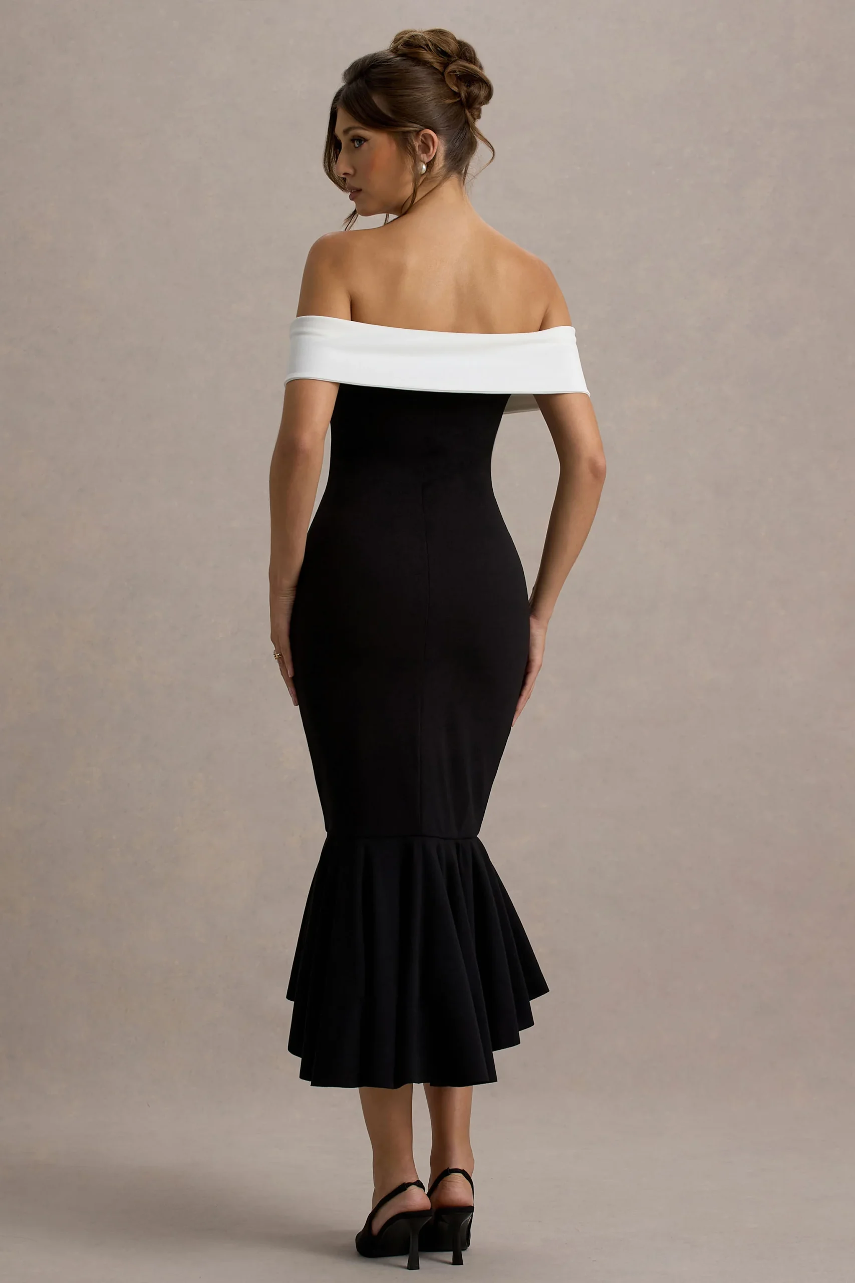 Corola | Vestido midi blanco y negro con escote bardot y volante