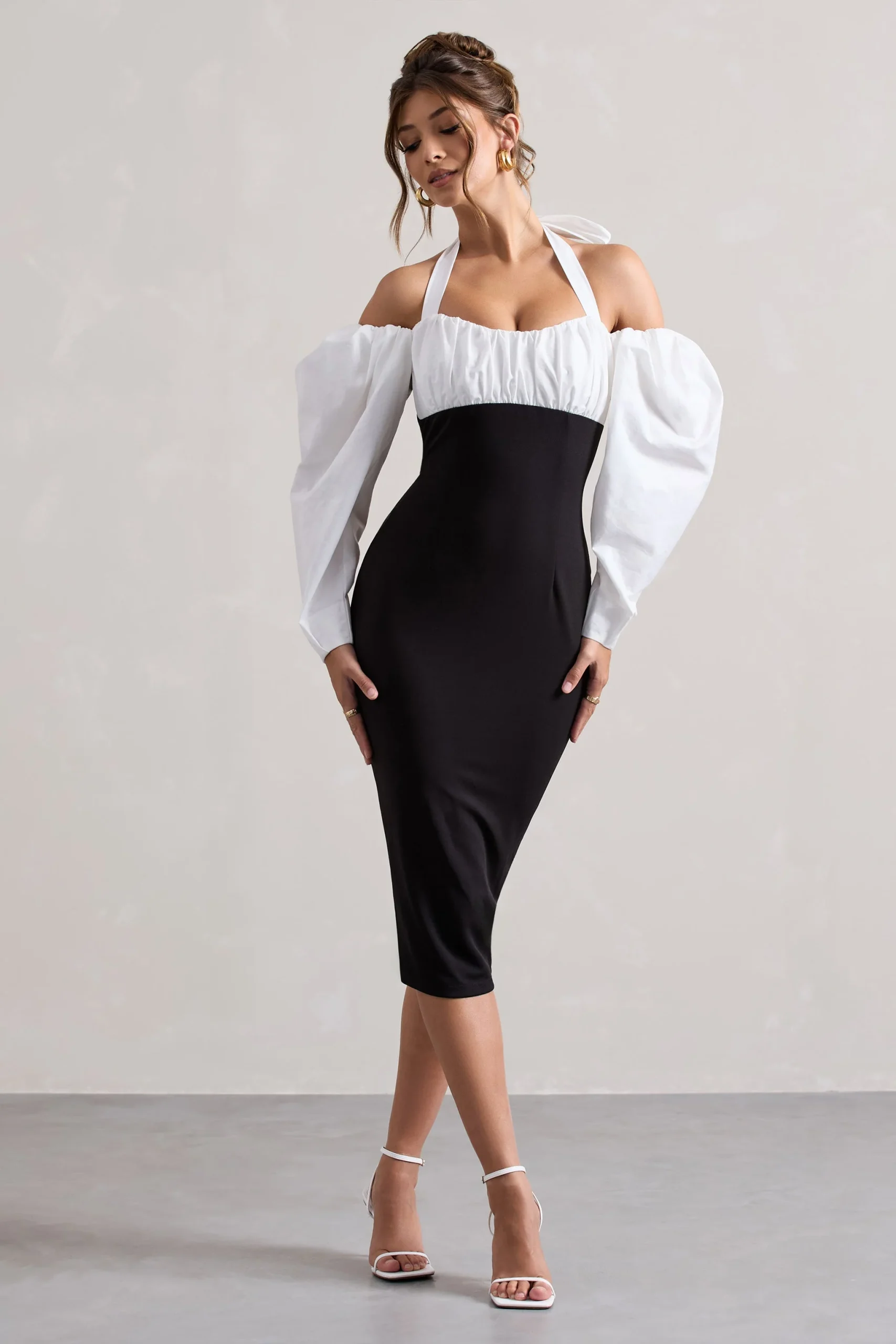 La sofisticación se encuentra con el romance en nuestro último midi Couture Client. Diseñado en un tejido de crepé de punto que esculpe la figura, este vestido midi en blanco y negro presenta un escote halter con lazada, elegantes mangas abullonadas y un favorecedor cuerpo ajustado. Combínalo con unos zapatos de tacón y un moño desenfadado para un look más sofisticado.