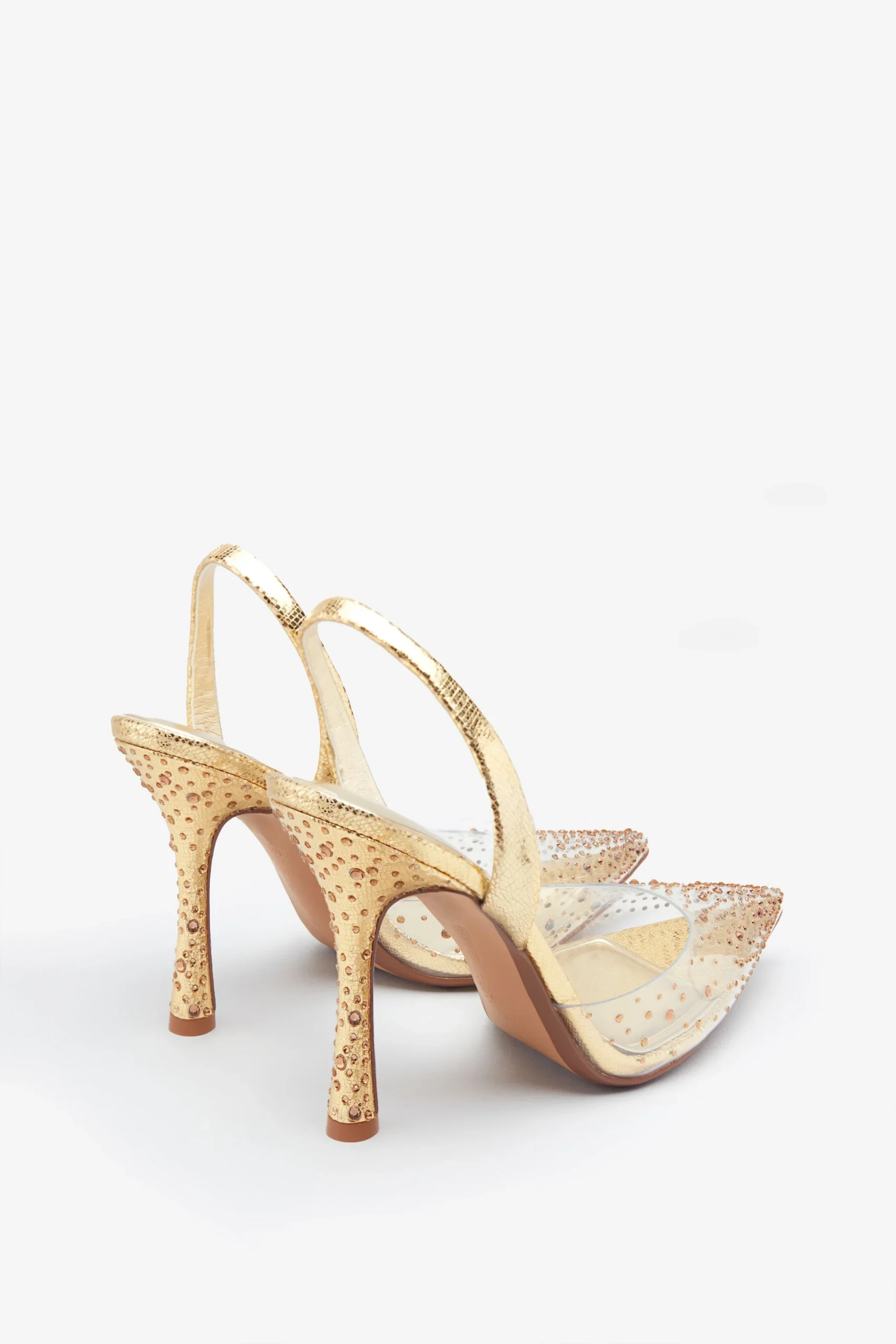 Cubiertos de adornos brillantes, estos deslumbrantes zapatos de salón dorados se definen por un cierre con tira trasera y un tacón de aguja adornado con brillantes. Completados con suelas acolchadas suaves, Covergirl es la adición perfecta a tu vestuario de etiqueta.