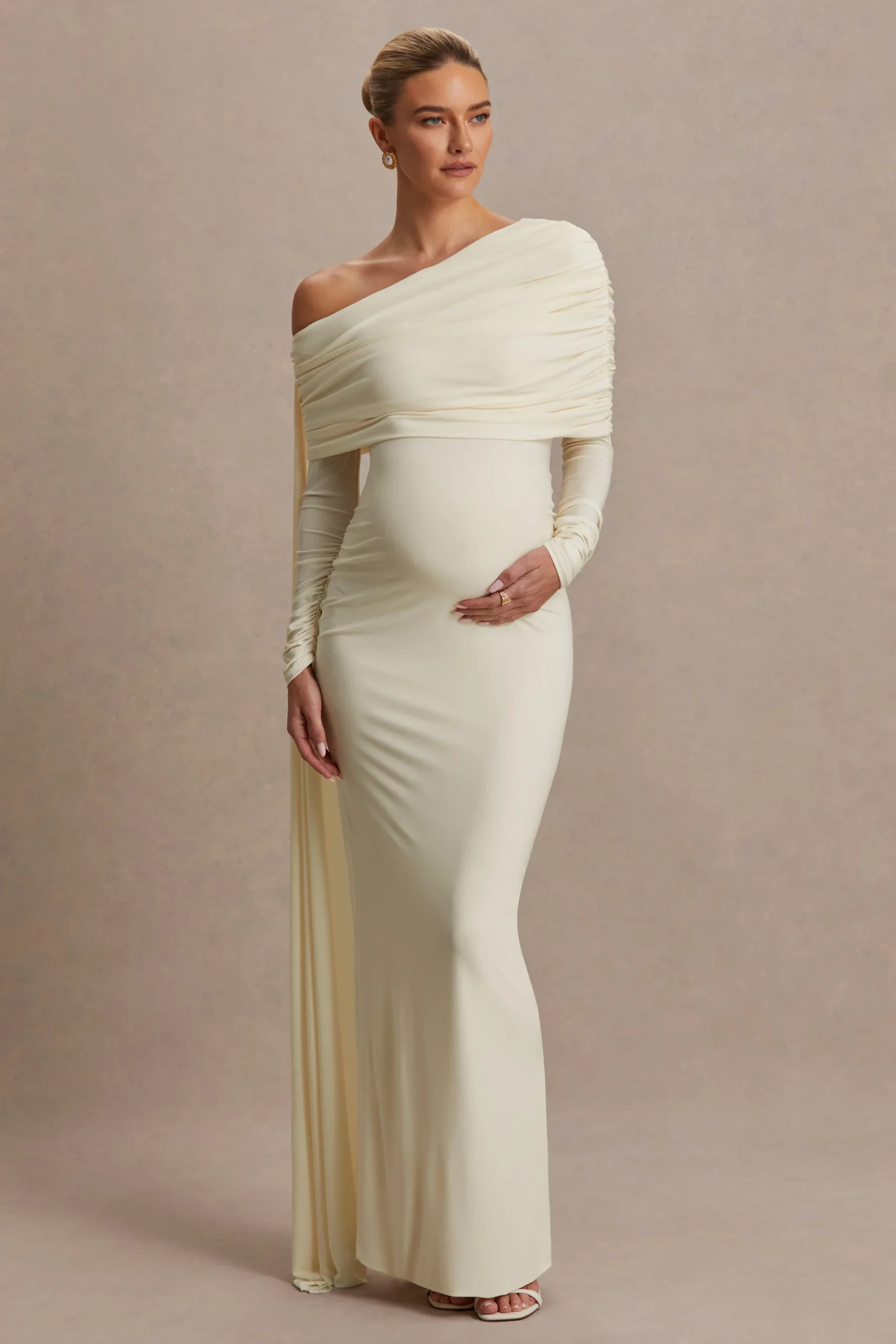 Cyra es sofisticación con un toque seductor, diseñada para dejar una impresión inolvidable. Confeccionado en nuestro jersey elástico premium en un tono crema intenso, este vestido largo se ajusta suavemente al cuerpo, ofreciendo un acabado liso y favorecedor. El escote bardot enmarca los hombros con elegancia, mientras que los detalles fruncidos añaden textura y dimensión. Rematado con un elegante fajín que cae con naturalidad, Cyra es la mezcla perfecta de glamour atemporal y atractivo moderno.