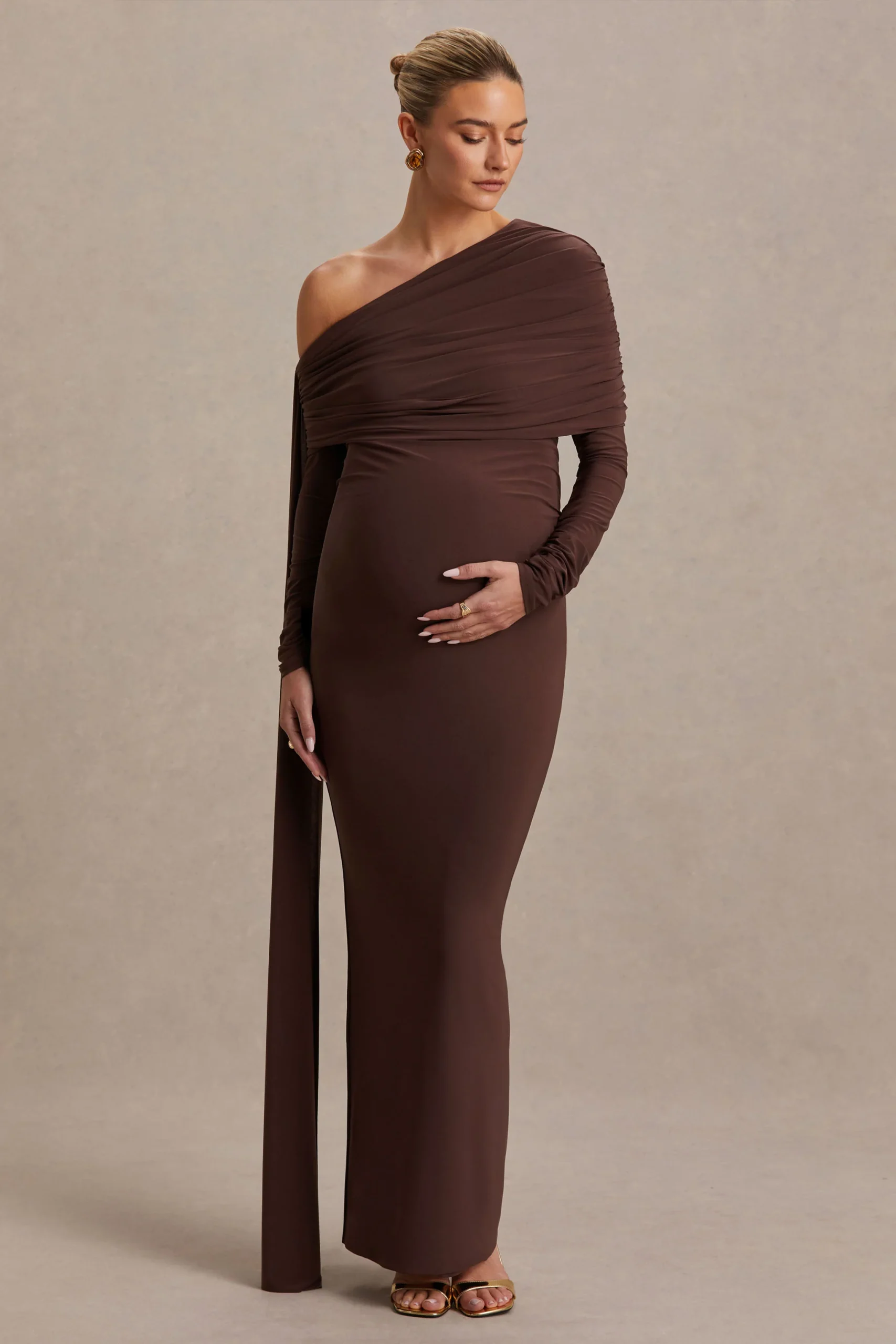 Cyra es sofisticación con un toque seductor, diseñada para dejar una impresión inolvidable. Confeccionado en nuestro jersey elástico premium en un intenso tono marrón, este vestido largo se ajusta suavemente al cuerpo, ofreciendo un acabado liso y favorecedor. El escote bardot enmarca los hombros con elegancia, mientras que los detalles fruncidos añaden textura y dimensión. Rematado con un elegante fajín que cae con naturalidad, Cyra es la mezcla perfecta de glamour atemporal y atractivo moderno.